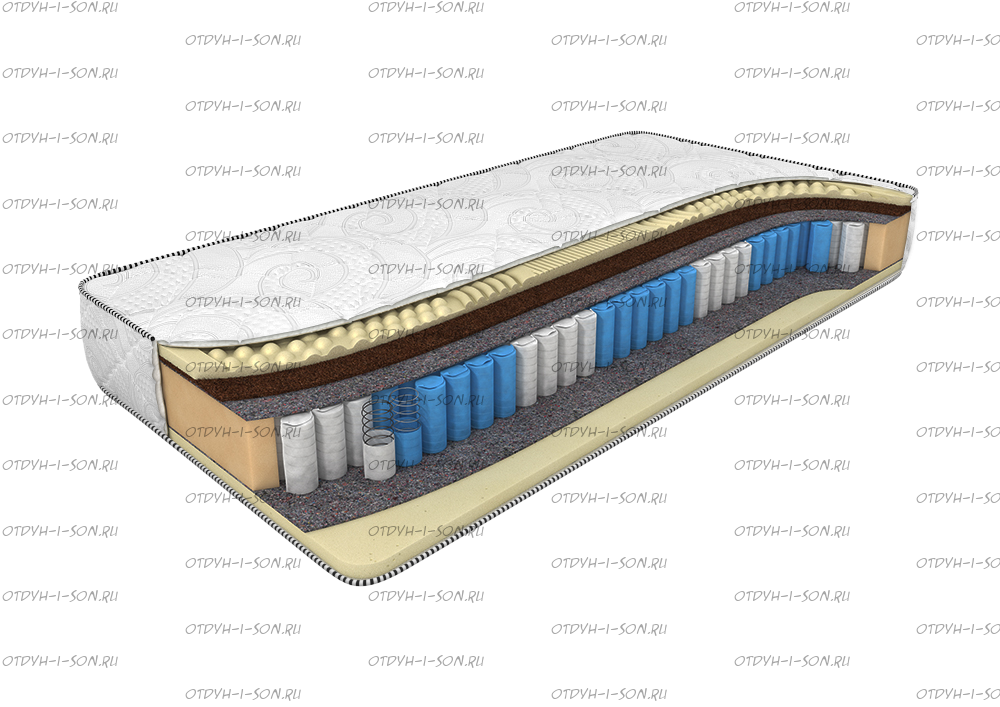 За основу матраса принят зональный блок независимых пружин Smart Zone. Пружинный блок точечно воспринимает нагрузку, особый контроль идет за областью головы, ног и поясничного отдела. Матрас прочный и износостойкий, способен выдерживать значительные нагрузки. Благодаря рельефной структуре натурального латекса матрас обладает микро-массажным и расслабляющим эффектом. Такое наполнение благоприятно сказывается на кровотоке, способствует снятию напряжения с мышц.