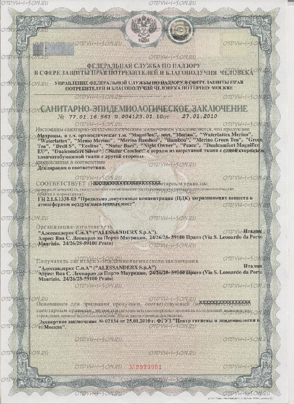 Современная вспененная латексная пена Elioform Magniflex обладает мелкопористой структурой и высокой плотностью, за счет чего материал обладает повышенными свойствами циркуляции воздуха и большим сроком службы. При эксплуатации матраса при воздействии на него с какой-либо стороны воздух выдувает все внутренние пылевые и другие элементы, гарантируя защиту от появления пылевых клещей.
