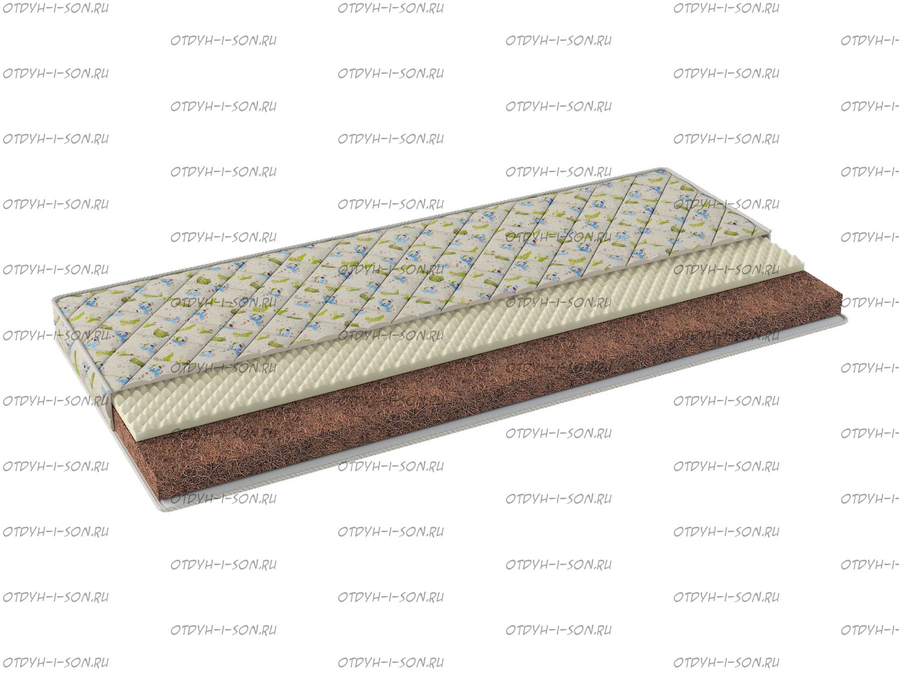 Матрас Velson Baby-5 Состав матраса по слоям: Чехол (поликоттон с детским рисунком, 35% хлопок, 65% полиэстр) Мемориформ (рельефный) 2-4 см Кокос 6 см Чехол (поликоттон с детским рисунком, 35% хлопок, 65% полиэстр) Характеристики: Размер: 60х120, 65х125, 70х140, 70х160, 80х160, 80х190/200, 90х190/200 Чехол несъемный (поликоттон с детским рисунком, 35% хлопок, 65% полиэстр, рисунок ткани чехла может меняться в зависимости от поставок) Высота: 9 см Рекомендуемая максимальная масса: до 60 кг Возможны нестандартные размеры матраса (уточняйте у оператора)