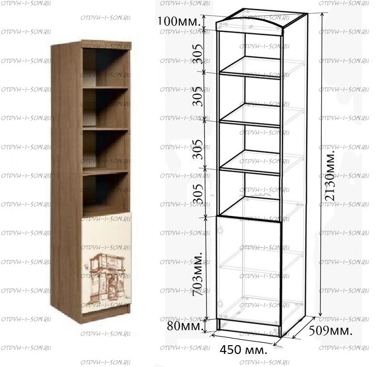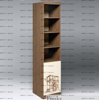 Шкаф-пенал Тревел ФТР/ПР-02. Узкий пенал-стеллаж из модульной серии мебели для детей и подростков из серии мебели Фанки Тревел производится из австрийского ламинированного ДСП в цвете Дуб Шамони или Дуб Молочный (16 мм толщиной), включает в себя четыре открытые ниши для книжек, игрушек, наград и граммот. Нижний ящик закрыт дверью и удобен для аккуратного хранения документов или детских вещей (в нутри есть одна полка). Фасад производится в цвете Дуб Молочный, на который наносится рисунок с изображением разных достопримечательностей из разных стран мира. Металлические крепления и европейская фурнитура, кромка ПВХ 2 мм толщины.