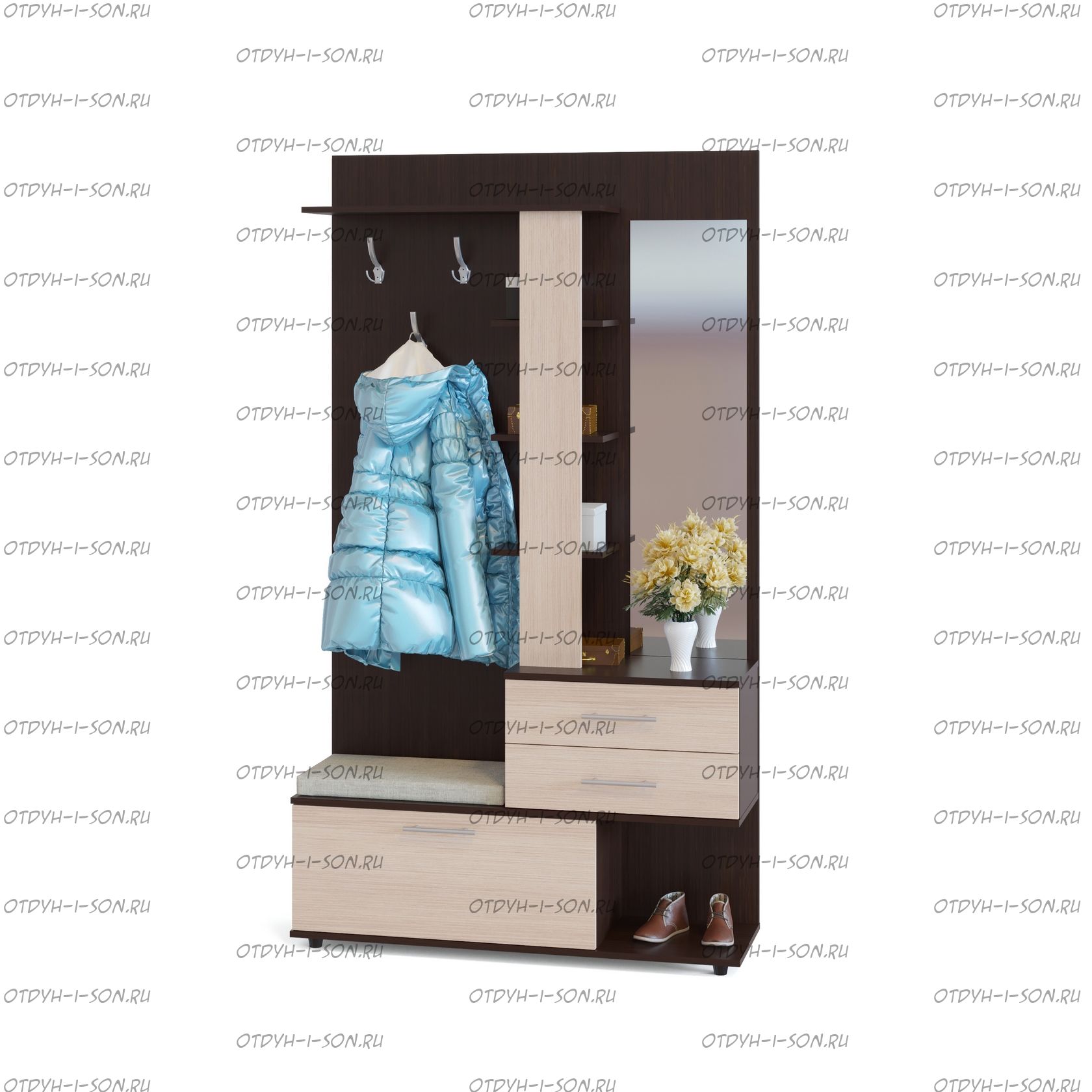 Прихожая Сокол ВШ-11 Характеристики: Габаритные размеры (ШхГхВ): 1170х360х2080 мм. Материалы: ЛДСП 16 мм. Цвета : Венге/Дуб млечный