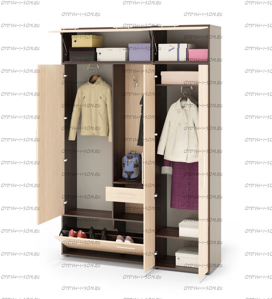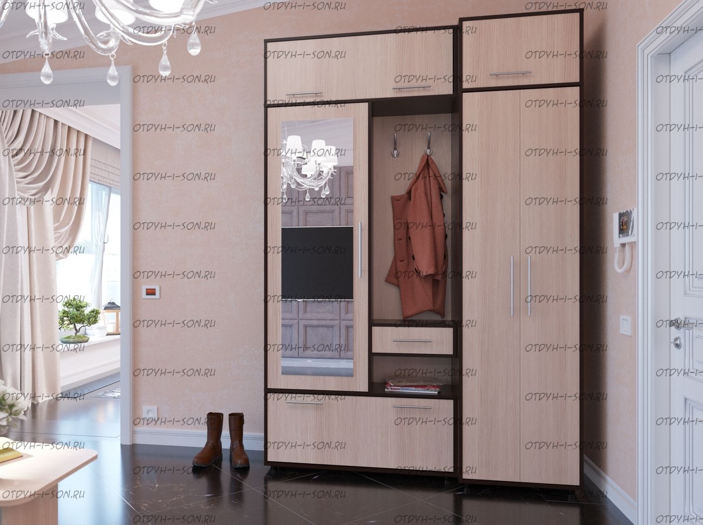 Прихожая Сокол ВШ-6+ШН-6+ШО-1+ШН-1 Характеристики: Габаритные размеры (ШхГхВ): 1650х430х2450 мм. Материалы: ЛДСП 16 мм. Цвета : Венге/Дуб млечный