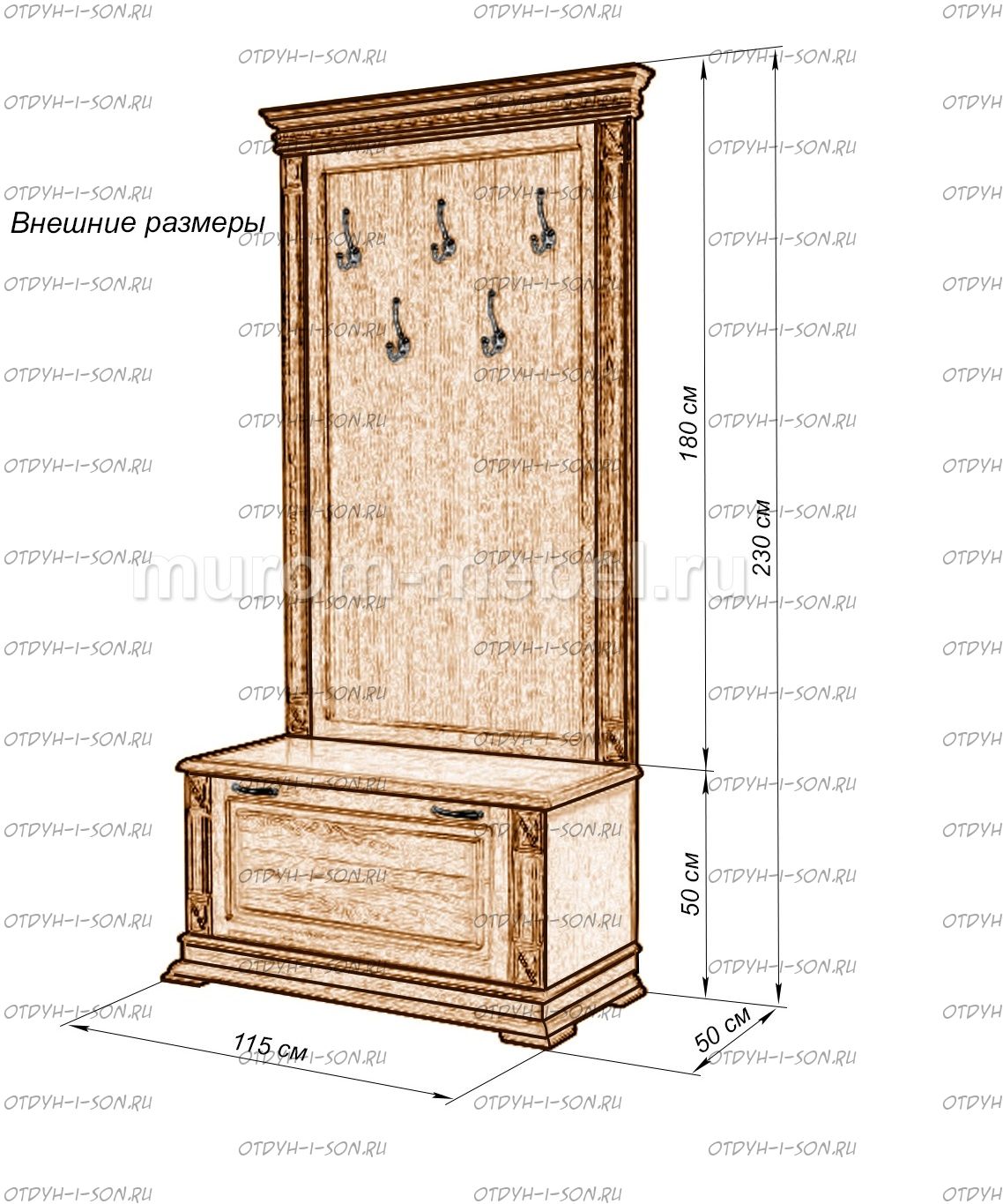 Прихожая Флоренция 2 (698х500х2300) Характеристики: Внешние габариты (ШхГхВ): 1150х500х2300 см. Материал: массив дерева Цвета: венге 1, венге 2, венге 3, венге 4, венге тон 2, коричневый тон 2, коричневый 1, коричневый 2, коричневый 3, коричневый 4, красно-коричневый тон 2, красно-коричневый 1, красно-коричневый 2, красно-коричневый 3, красно-коричневый 4, лак Стоимость в цветах Белая эмаль, Слоновая кость, Выбеленный дуб, Венге перламутровый и Красный +25% к стоимости изделия.