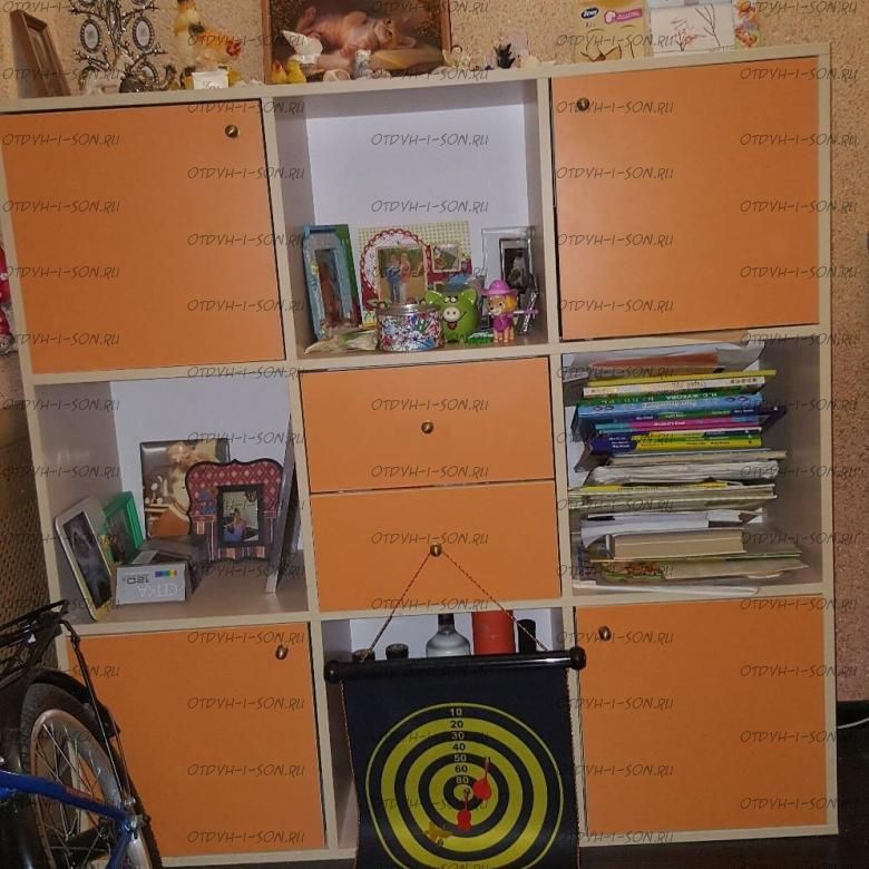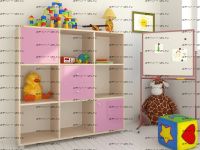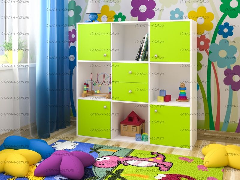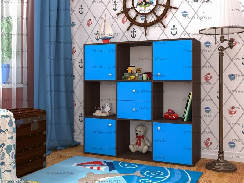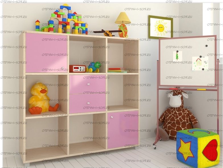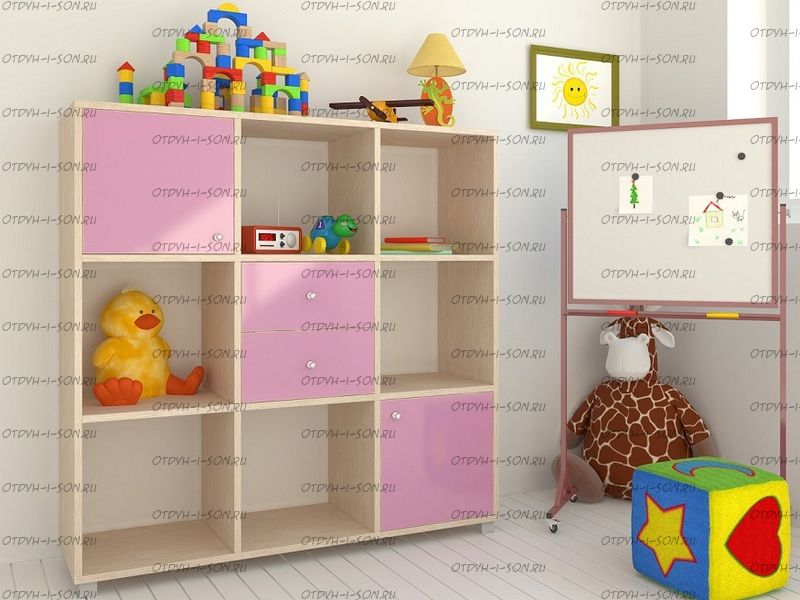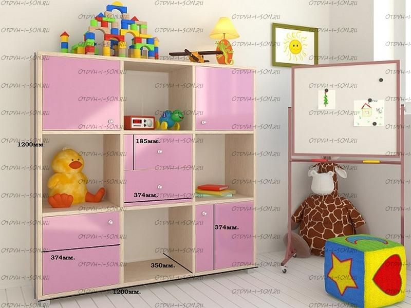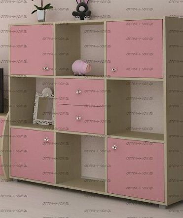Стеллаж Джери (1200х350х1200) Характеристики: Внешние габариты (ШхГхВ): 1200х350х1200 мм Два выдвижных ящика, два отделения с распашными дверцами и шесть открытых отделений Материал: ЛДСП Цвет корпуса: дуб молочный, венге, вишня, орех донской, белое дерево, бодего темный Цвета фасада: розовый, оранжевый, ирис, лайм, голубой, зеленый, бежевый, красный, бодего темный, дуб молочный, венге, вишня, орех донской, белое дерево.