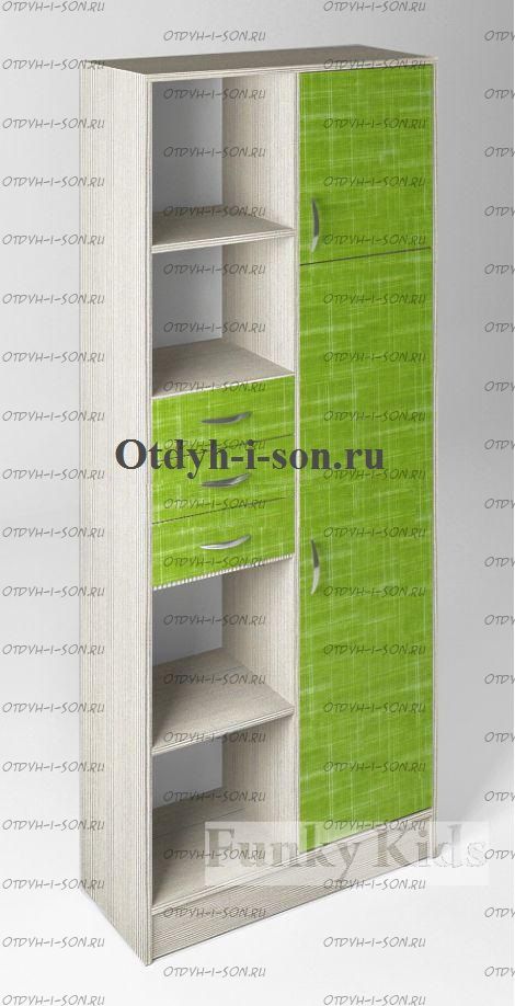 Стеллаж Фанки Кидз 13/9СВ Характеристики: Внешние габариты: 750х330х1850 Материал: ЛДСП 16 мм (Австрия, Egger). Вес: 62 кг Объем: 0,095 м3 Цвет корпуса: ольха, дуб кремона, венге, орех Цвет фасада: розовый, крем ваниль, оранжевый, зеленый, голубой, венге, дуб кремона, ольха, орех