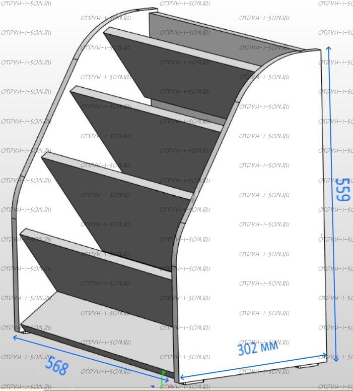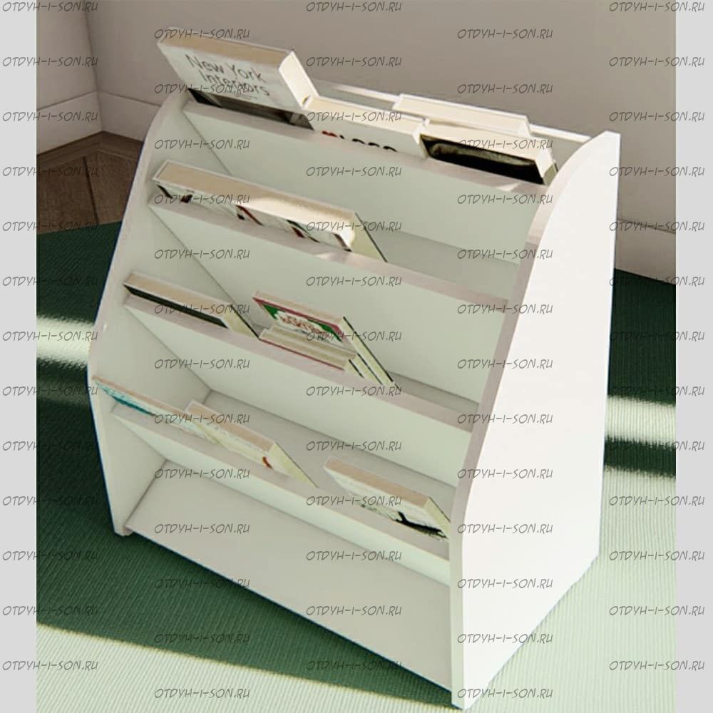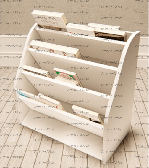 Стеллаж для книг Сказка, белый ДС-23 Характеристики: Внешние габариты: Ш56,8 х Г 30,2 х В55,9 см. Расстояние между полками 98 мм.