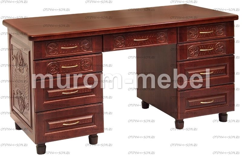 Стол письменный Резной Характеристики: Внешние габариты (ШхГхВ): 1500х600х750 мм Комбинированная мебель: Массив сосны и вставки из экологически чистой мебельной фанеры Крепления: Цвет: венге 1, венге 2, венге 3, венге 4, венге тон 2, коричневый тон 2, коричневый 1, коричневый 2, коричневый 3, коричневый 4, красно-коричневый тон 2, красно-коричневый 1, красно-коричневый 2, красно-коричневый 3, красно-коричневый 4, лак Изготовление из массива березы плюс 30% Изготовление в белом цвете или слоновая кость плюс 20%