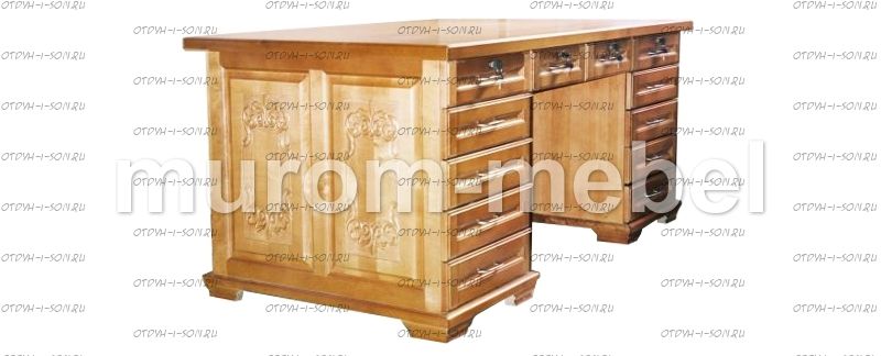 Стол письменный двухтумбовый. Царственным декором наполнен письменный стол. Сбоку стол украшают элементы ручной резьбы. Под столешницей расположены две тумбы с выдвижными ящиками. Классический стол изготовлен из массива натурального дерева.