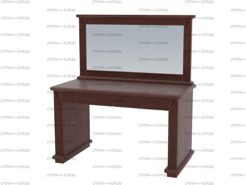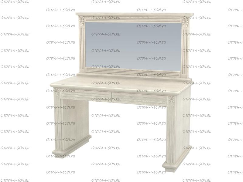 Стол туалетный с зеркалом Палермо Лайт Массив DreamLine (90х45х74). На просторной столешнице туалетного столика можно расположить огромное количество нужных вещей. Два тонких ящика предназначены для хранения различных мелочей. Достоинство этой модели в её роскошной отделке. Резные каннелюры украшают массивные планки-ножки, выдвижные ящики и раму огромного зеркала. В углах столика расположены фигурные резные элементы лиственных мотивов. Карниз зеркала, а также ножки и столешница имеют выпуклый ободок. Использовать туалетный столик благодаря высококачественной фурнитуре легко и приятно.