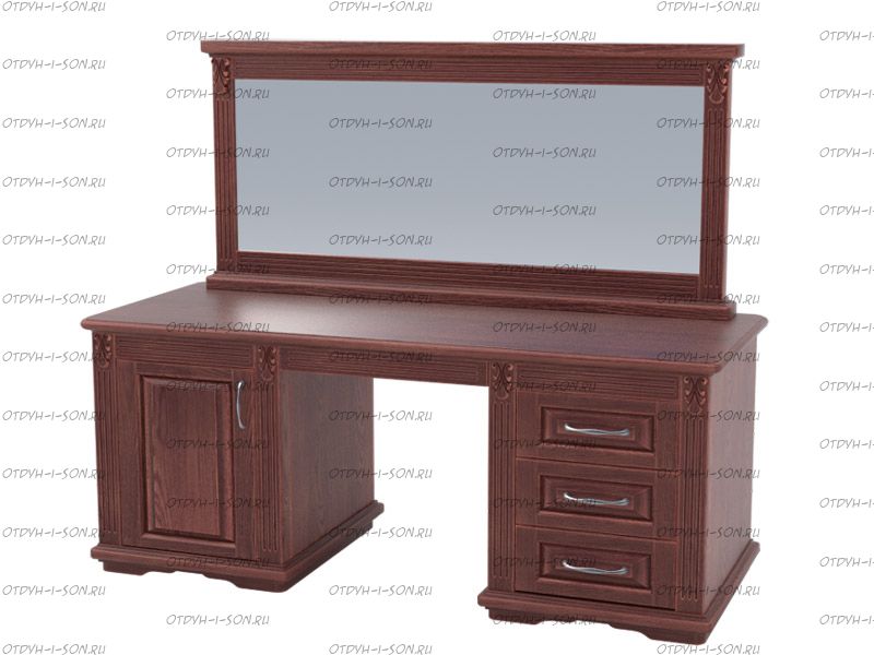 Стол туалетный с зеркалом Палермо Элит Массив DreamLine (145х43,5х74) Характеристики: Внешние габариты (ШхГхВ): 145х43,5х74 см Внешние габариты зеркала (ШхВ): 127х77 см Материал: массив бука, массив ясеня Цвет массива бука: слоновая кость, груша, орех, орех патина, орех мокко,старая вишня, красное дерево, каштан, венге, олива, серый. Цвет массива ясеня: белый, белый серая патина, белый золотая патина, слоновая кость, беленый дуб, дуб сономо, натуральный ясень,натуральный дуб, груша, пинотекс, дуб золотой, орех, орех мокко, старая вишня, красное дерево, каштан, венге серебряная патина, венге, олива, серый. За цвета из массива ясеня: натуральный ясень, груша, беленый дуб – прибавляется 10% к стоимости, белый золотая патина, венге серебряная патина, белый серая патина – 15% За цвета из массива бука: груша, натуральный бук, беленый дуб - прибавляется 10% к стоимости, орех патина - 15%