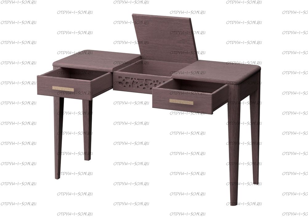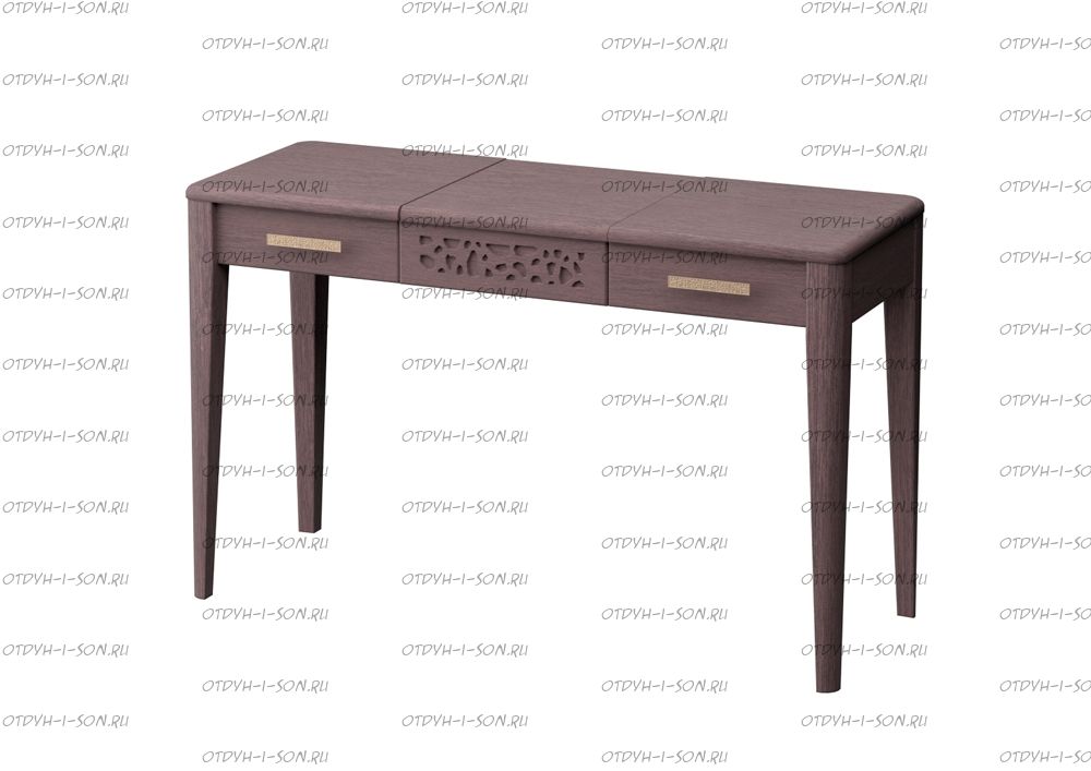 Стол туалетный без зеркала Веро Массив DreamLine. Компактный и красивый стол в котором все продумано до мелочей. Три ящика – помогут спрятать необходимые личные вещи. Два ящика по краям стола являются выкатными, а один ящик расположенный в центральной части стола открывается вверх. Неизменным остается наличие резьбы, «изысканной геометрии», которая и стала визитной карточкой всех мебельных изделий в коллекции спальни Веро.