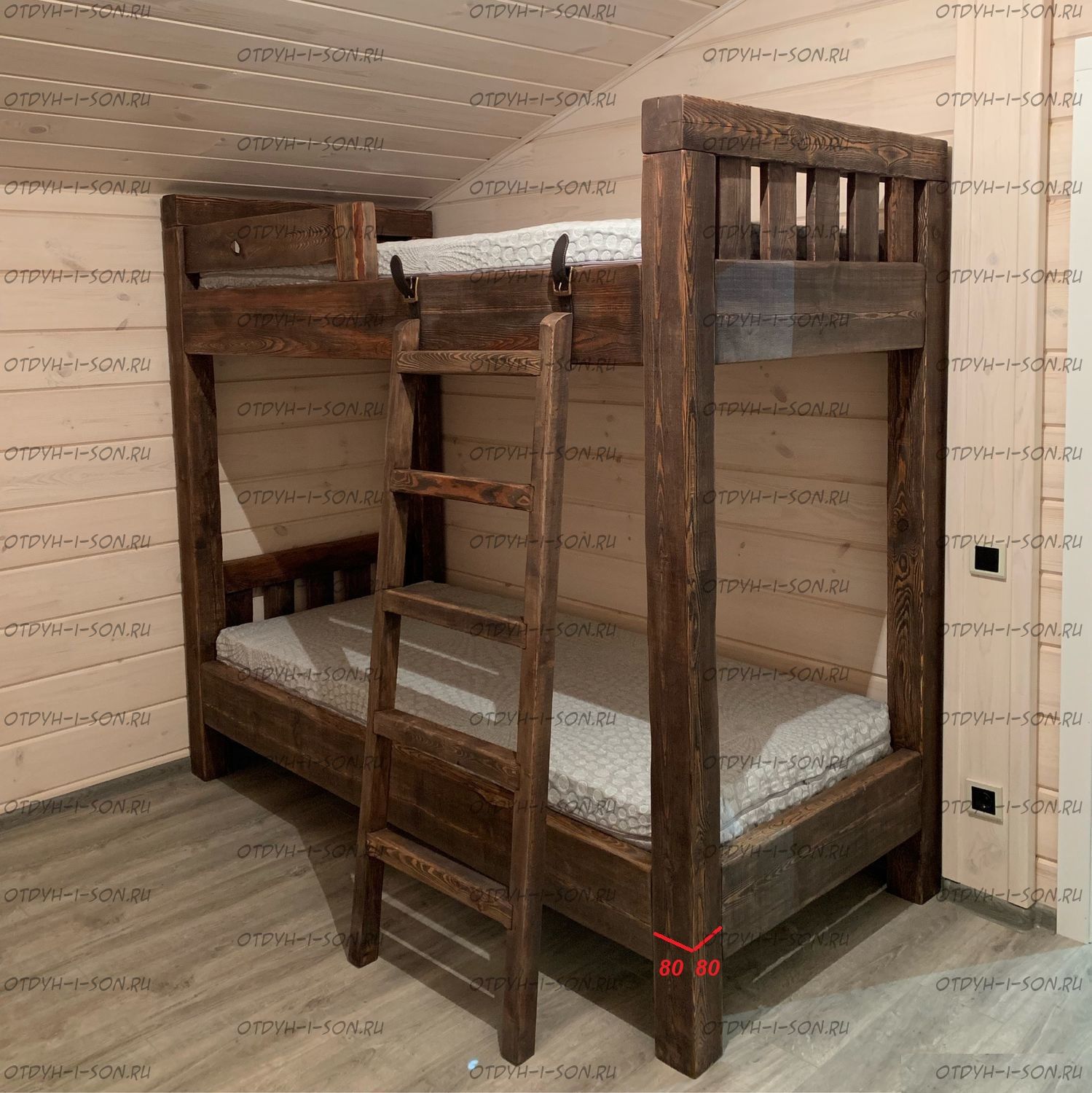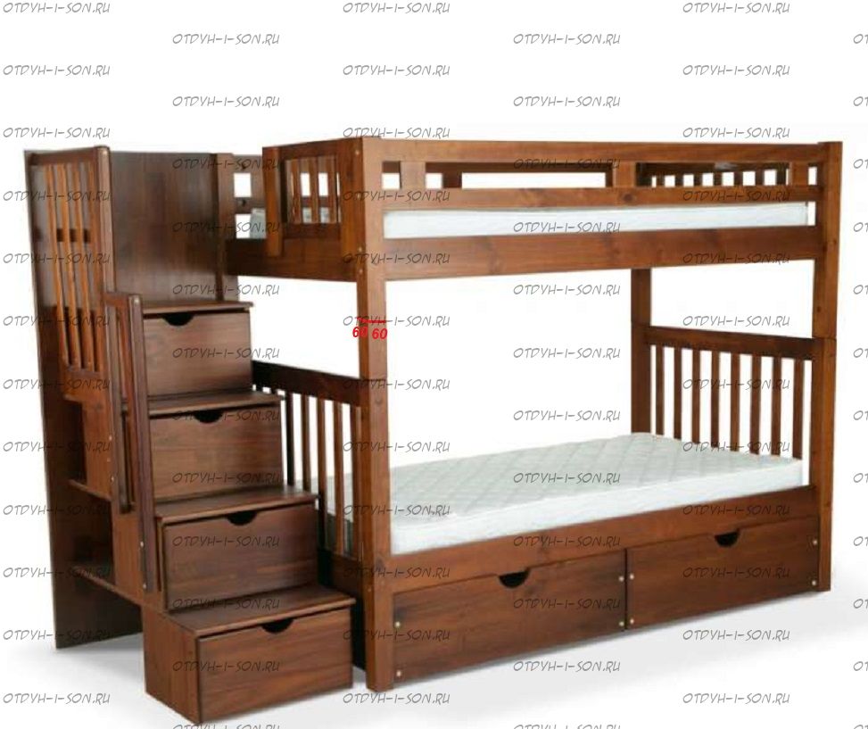 Толщина вертикальных реек двухъярусной кровати из массива Характеристики: Брус используется не клееный.