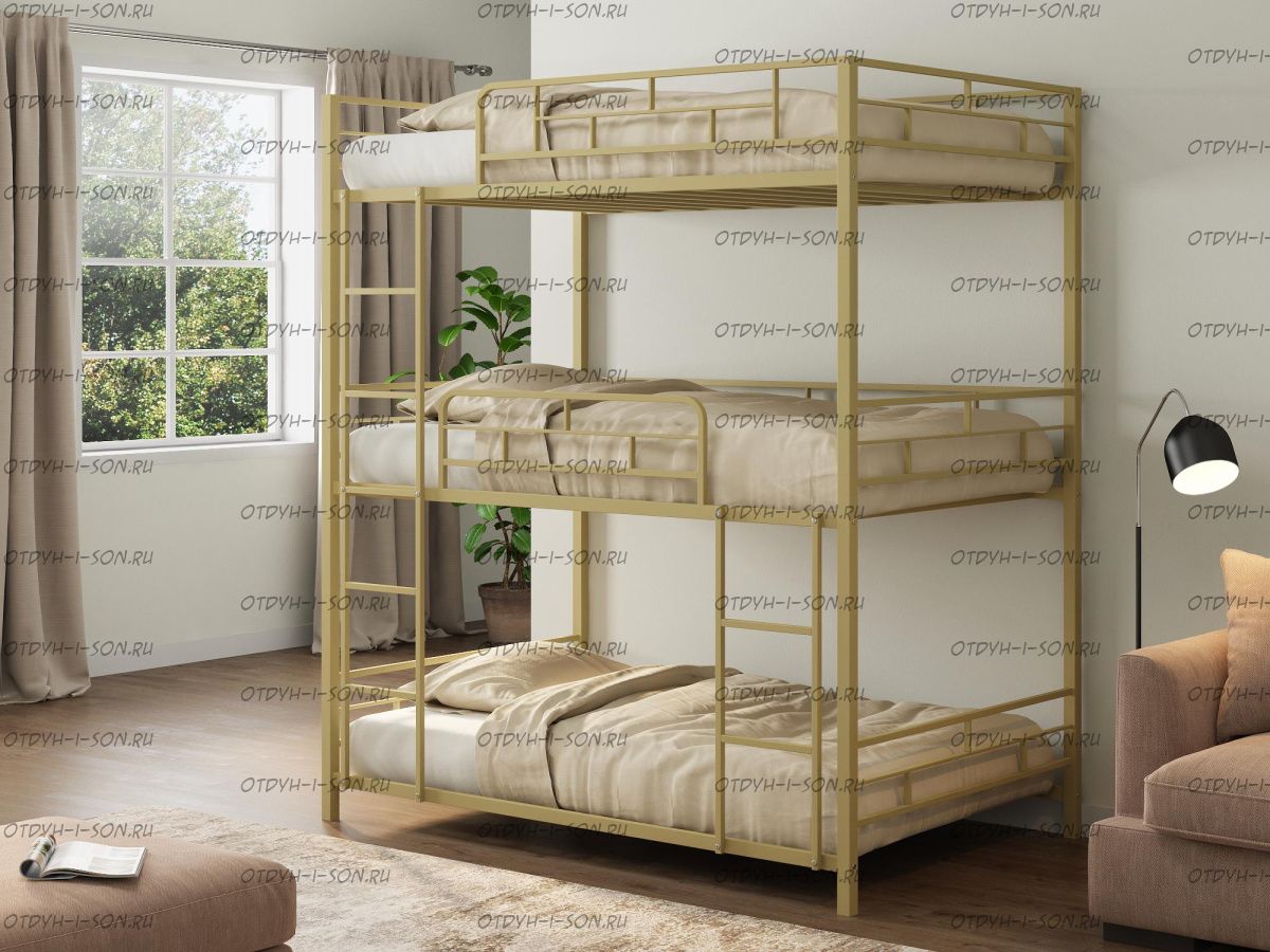 Трехярусная кровать Эверест (120х198х241),любые цвета Характеристики: Спальное место: 120х200 Внешние размеры (ДхШхВ): Длина 199 х Ширина 120 х Высота 240 Высота от пола до спального места: Материал каркаса Металл Материал фасада ЛДСП Нагрузка на спальное место: 150 кг Вес: Цвет каркаса: бежевый, черный, коричневый, Черный ящики Цвет фасада: Дуб беленый, Дуб ватан Гарантия 12 месяцев