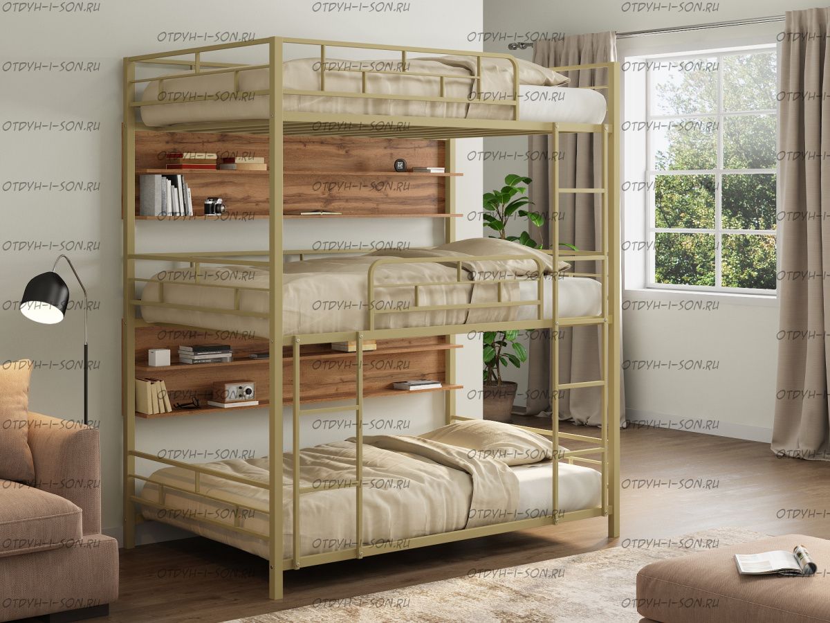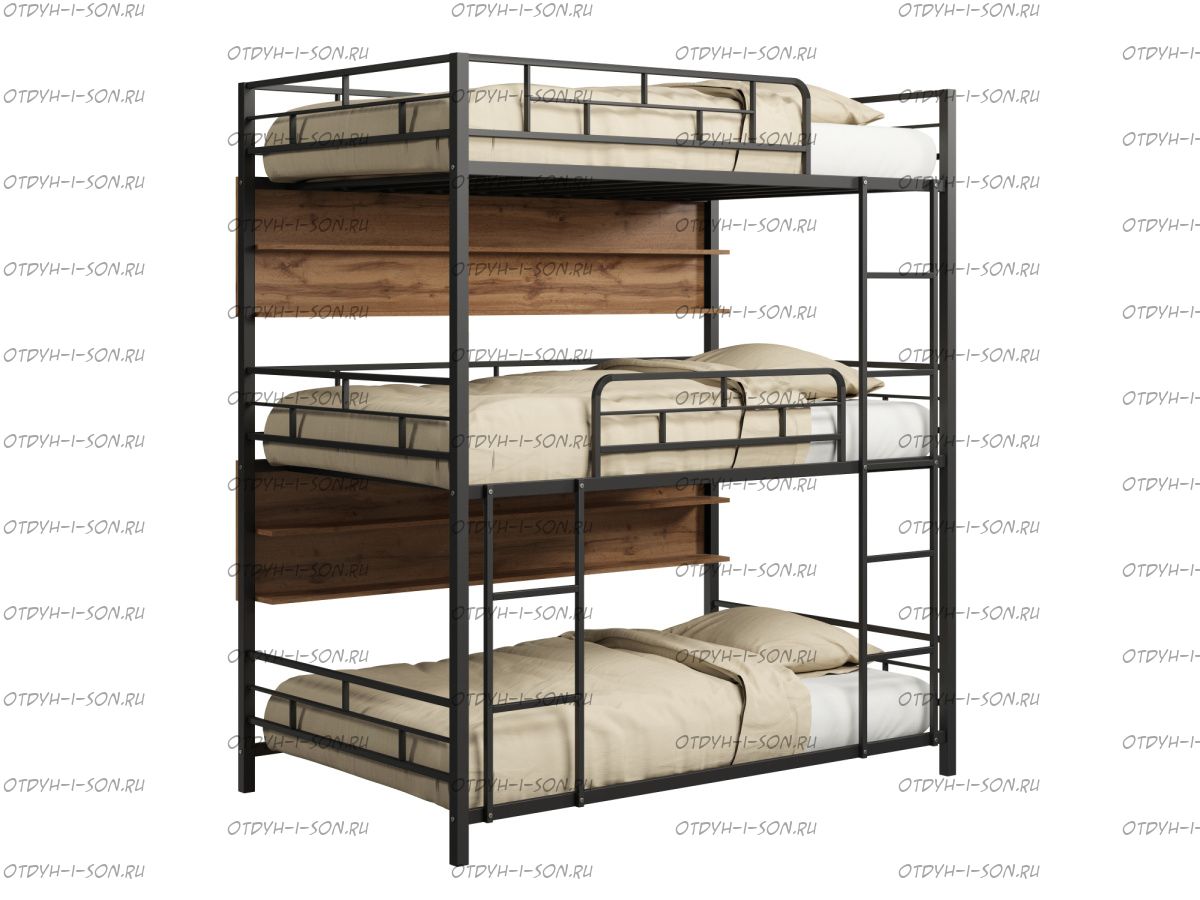 Трехярусная кровать Эверест 90 (90х198х241),любые цвета Характеристики: Спальное место: 90х190 Внешние размеры (ДхШхВ): Длина 198 х Ширина 90 х Высота 241 Высота от пола до спального места: Материал каркаса Металл Материал фасада ЛДСП Нагрузка на спальное место: 150 кг Вес: Цвет каркаса: бежевый, черный, коричневый, Черный ящики Цвет фасада: Дуб беленый, Дуб ватан Гарантия 12 месяцев