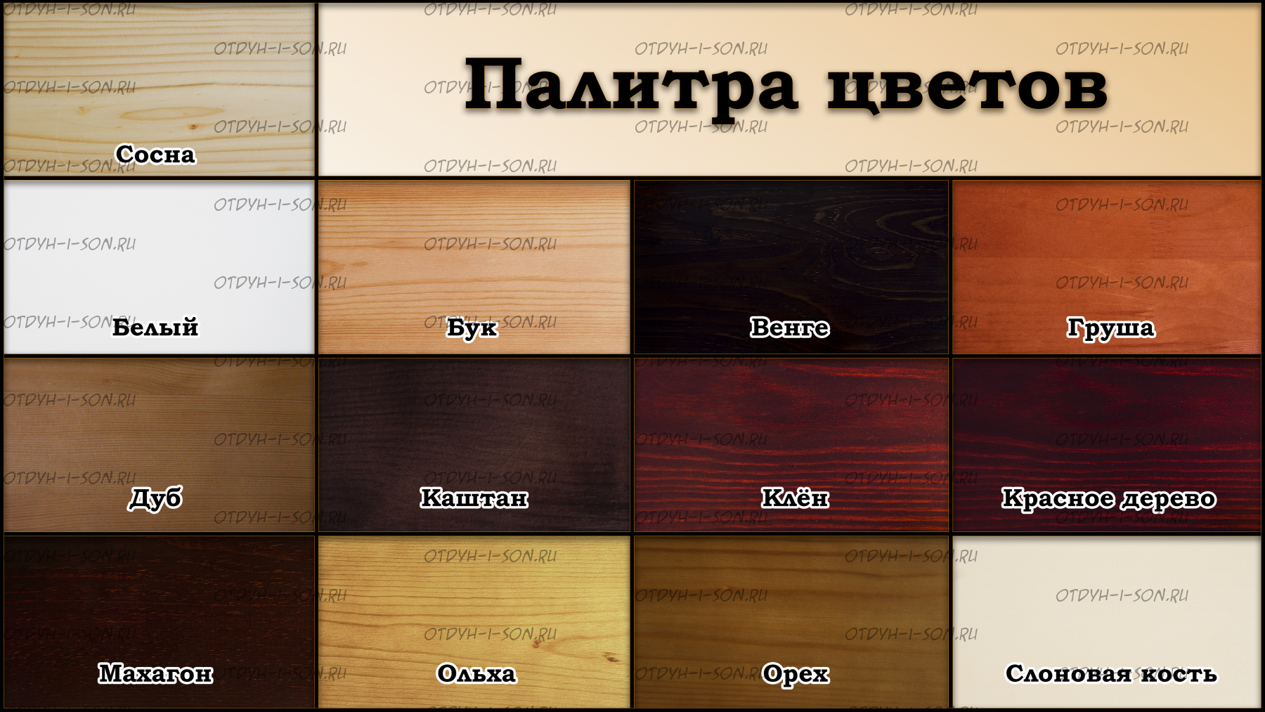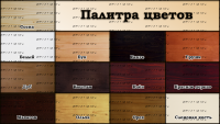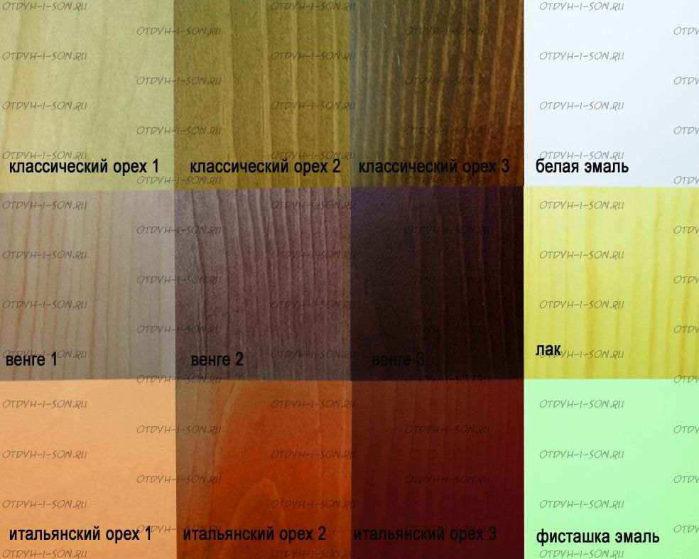 • Цвет: орех, бук, венге, груша, дуб, каштан,  клен, красное дерево, махагон, ольха, сосна, белый (эмаль), слоновая кость (эмаль)