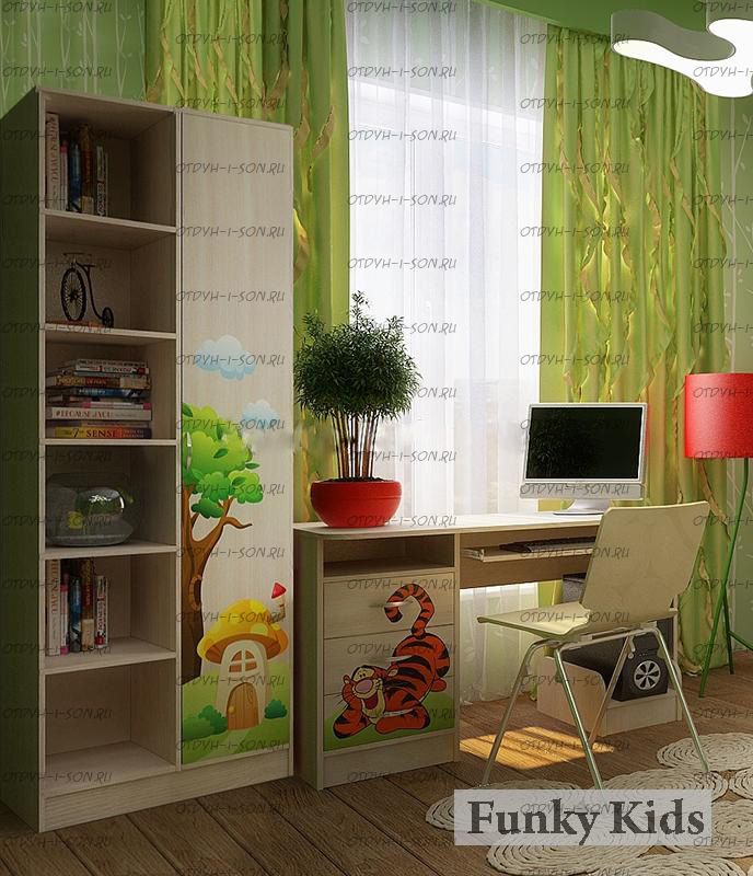 Уголок школьника Винни Пух №3 Комплектация: Стеллаж Винни Пух 13/4 (ШхГхВ): 750х330х2000 мм. Стол письменный Винни Пух 13/1 (ШхГхВ): 1200х600х750 мм. Характеристики: Материал: ЛДСП 16 мм (Австрия, Egger). Цвет корпуса: Дуб Кремона Цвет фасада: УФ-фотопечать