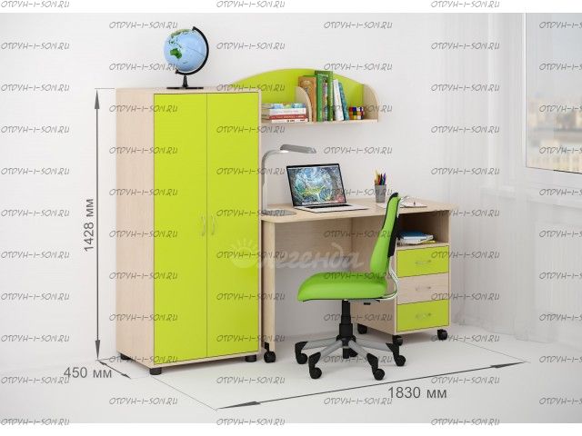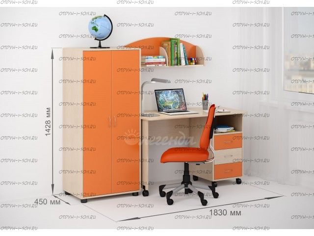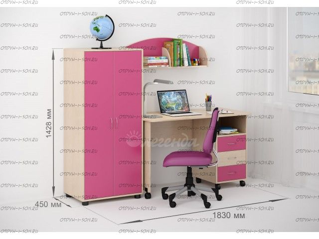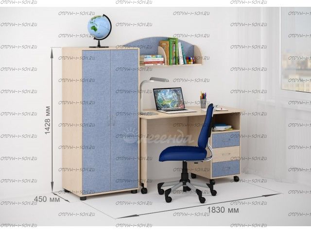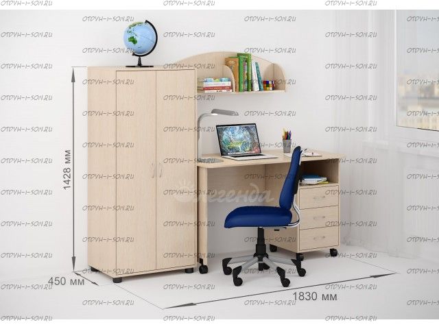 Уголок школьника Легенда №19 Комплектация: Полка навесная Легенда Л-08: 936×182×296 Стол письменный (компьютерный) Легенда Л-03: 1200×600×749 Шкаф двустворчатый Легенда Л-02:628×446×1428 Характеристики: Габариты (ШхГхВ): 1830×600×1428 Мебель универсальная, может быть собрана в лево- или правостороннем варианте Цвет корпуса: венге светлый Цвет фасада: венге светлый, голубой, оранжевый, розовый, лайм