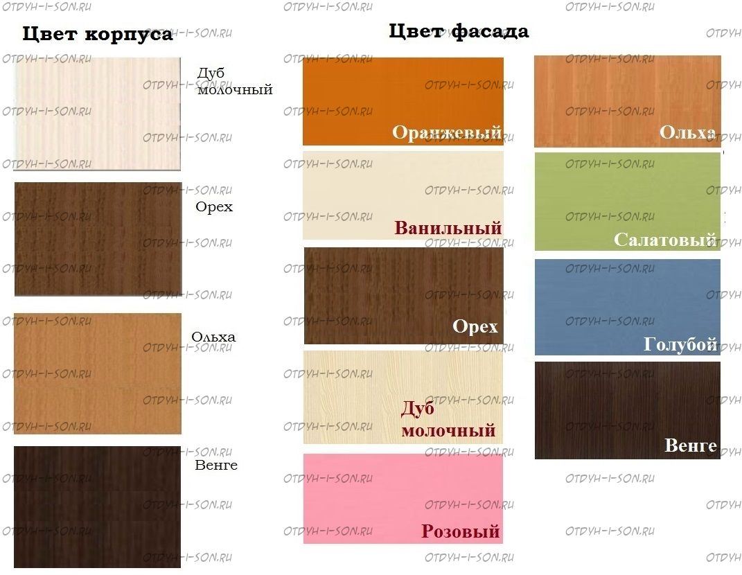 Доступные цвета: Корпус: Дуб молочный, Дуб сонома, Венге, Орех, Белый; Фасады: Белый, Желтый, Ольха, Оранжевый, Орех, Дуб молочный, Голубой, Салатовый, Крем ваниль, Розовый, Венге, Зеленый текстиль |