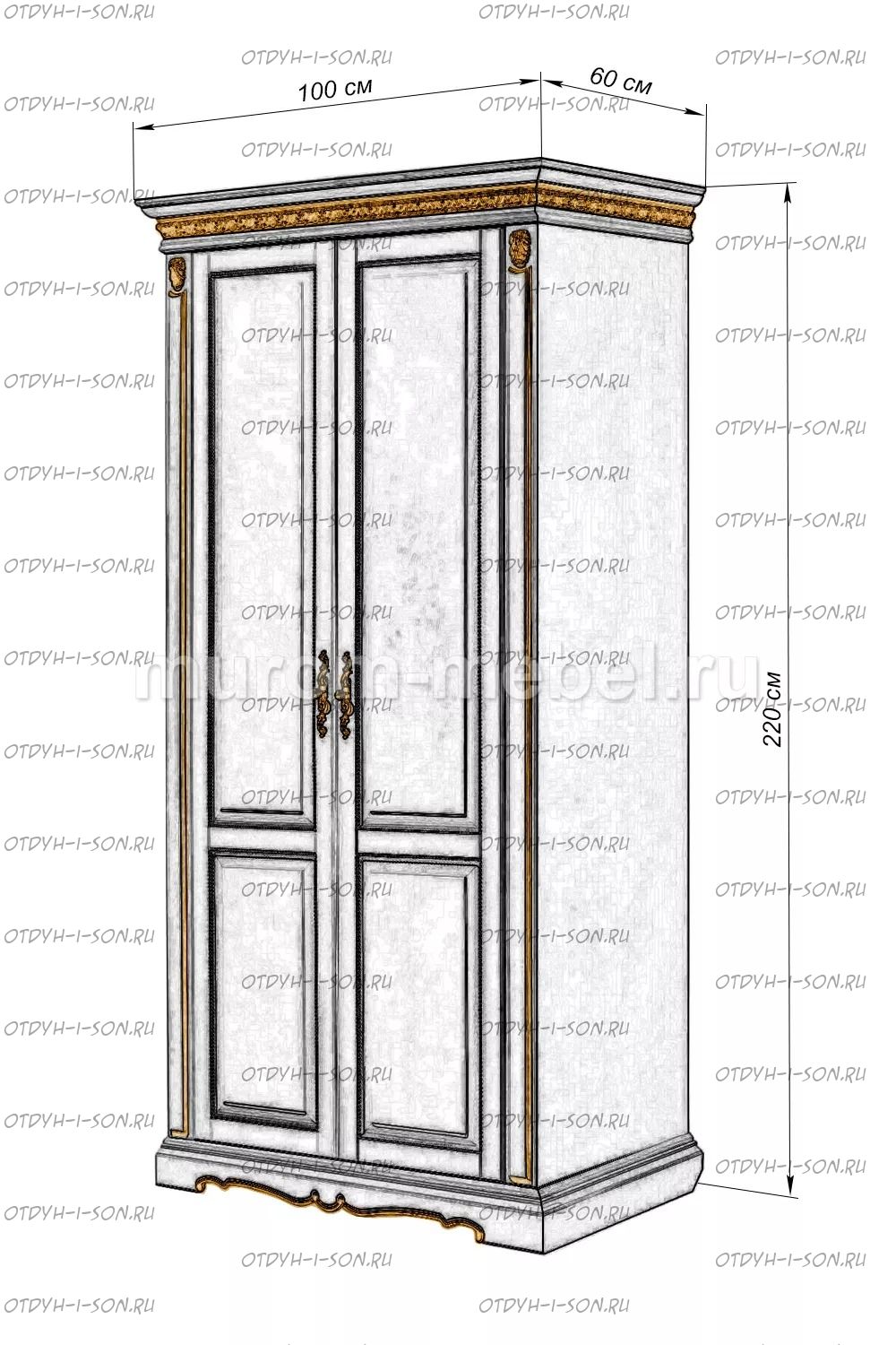 Шкаф Милано 2-х створчатый Характеристики: Внешние габариты (ШхГхВ): 1000х600х2200 мм Материал: массив дерева Цвета: венге 1, венге 2, венге 3, венге 4, венге тон 2, коричневый тон 2, коричневый 1, коричневый 2, коричневый 3, коричневый 4, красно-коричневый тон 2, красно-коричневый 1, красно-коричневый 2, красно-коричневый 3, красно-коричневый 4, лак Стоимость в цветах Белая эмаль, Слоновая кость, Выбеленный дуб, Венге перламутровый и Красный +25% к стоимости изделия.