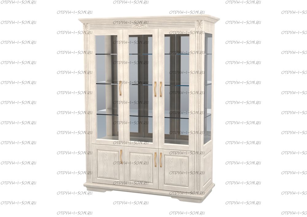 Шкаф-витрина 3-дверный Палермо Массив DreamLine Характеристики: Внешние габариты (ШхГхВ): 161х54х220 см Материал: массив бука, массив ясеня Цвет массива бука: слоновая кость, груша, орех, орех патина, орех мокко,старая вишня, красное дерево, каштан, венге, олива, серый. Цвет массива ясеня: белый, белый серая патина, белый золотая патина, слоновая кость, беленый дуб, дуб сономо, натуральный ясень,натуральный дуб, груша, пинотекс, дуб золотой, орех, орех мокко, старая вишня, красное дерево, каштан, венге серебряная патина, венге. За цвета из массива ясеня: натуральный ясень, груша, беленый дуб – прибавляется 10% к стоимости, белый золотая патина, венге серебряная патина, белый серая патина – 15% За цвета из массива бука: груша, натуральный бук, беленый дуб - прибавляется 10% к стоимости, орех патина - 15%