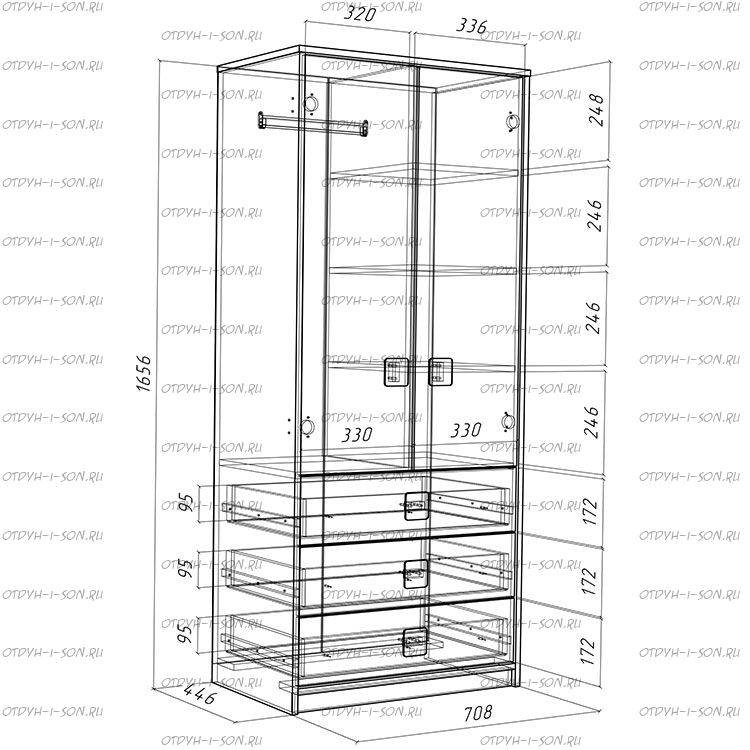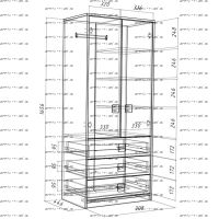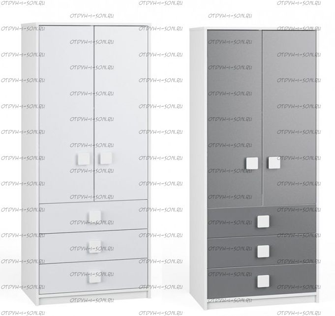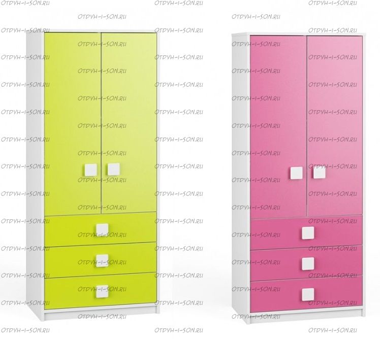 Шкаф двухдверный Легенда Л-07 Характеристики: Габариты (ШхГхВ): 708 × 446 × 1656 мм. Наполнение шкафа: две зоны с четырьмя полками и со штангой для «плечиков». Внизу три выдвижных ящика. Цвет корпуса: белый Цвет фасада: Белый, Титан, Розовый, Лайм, Сонома светлый