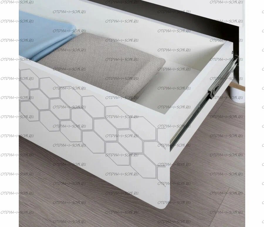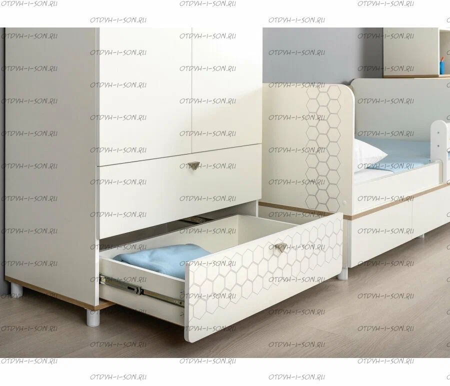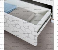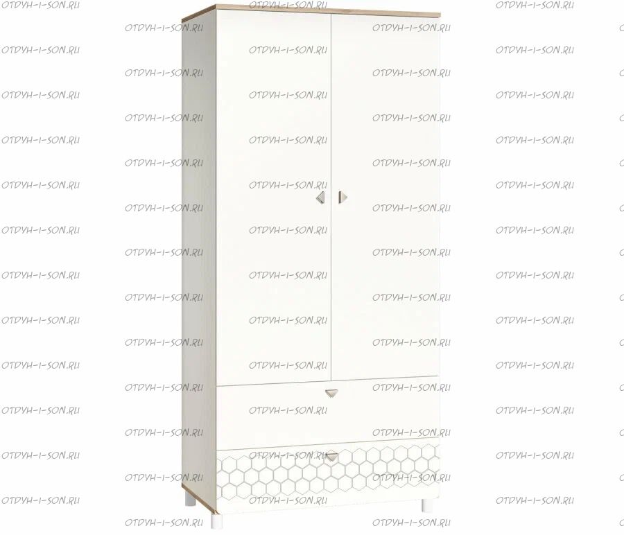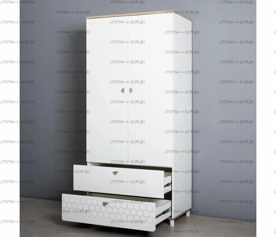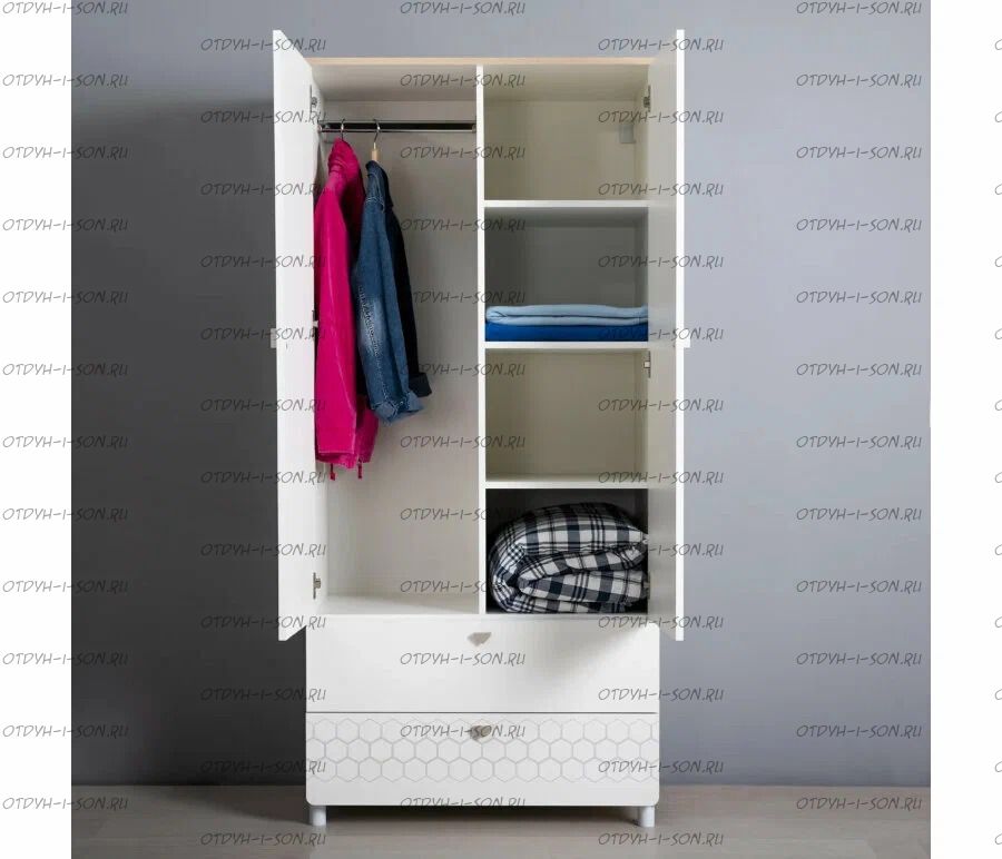 За распашными дверками расположено отделение со штангой для одежды на плечиках и отделение с тремя полка. В нижней части расположено два выдвижных ящика на шариковых направляющих полного выдвижения, что значительно повышает функционал.