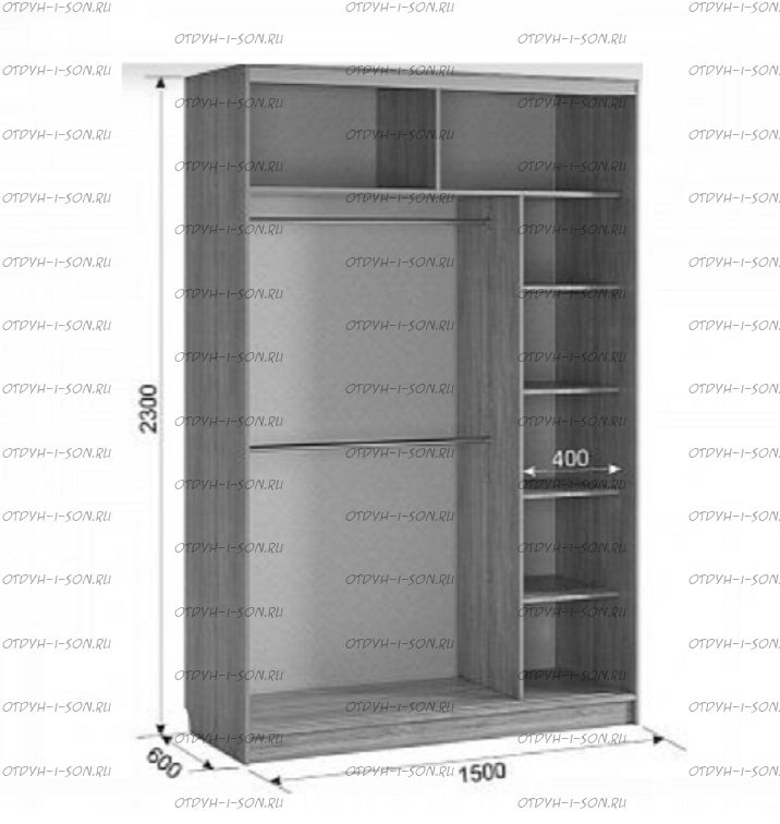 Шкаф-купе Гранд 5 Характеристики: Внешние размеры: Ширина: 1500, Глубина: 600, Высота: 2300 Цвета: Венге, Дуб сономма, Дуб беленый