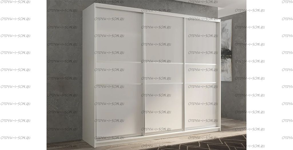 Шкаф-купе трехдверный Кааппи 11 Характеристики: Дверь 1: ЛДСП/Стекло Lacobel белое Дверь 2: ЛДСП/Стекло Lacobel белое Дверь 3: ЛДСП/Стекло Lacobel белое Наполнение: 8 полок, 2 штанги (глубина 45 см - штанги выкатные) Полки можно установить в любом ме сте с шагом 64 мм