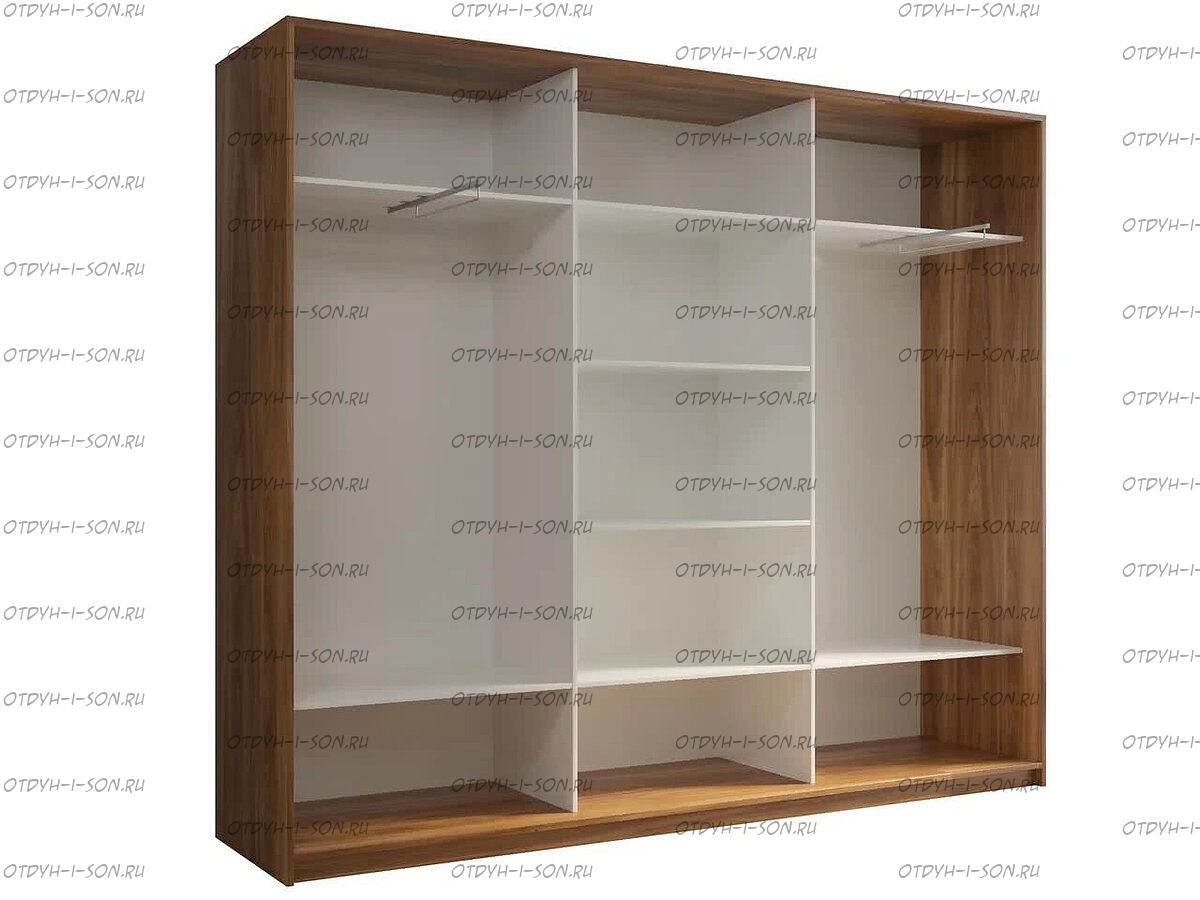 Шкаф-купе трехдверный Кааппи 3 Характеристики: Дверь 1: Зеркало Дверь 2: ЛДСП Дверь 3: Зеркало Наполнение: 8 полок, 2 штанги (глубина 45 см - штанги выкатные) Полки можно установить в любом месте с шагом 64 мм