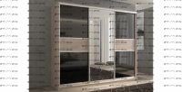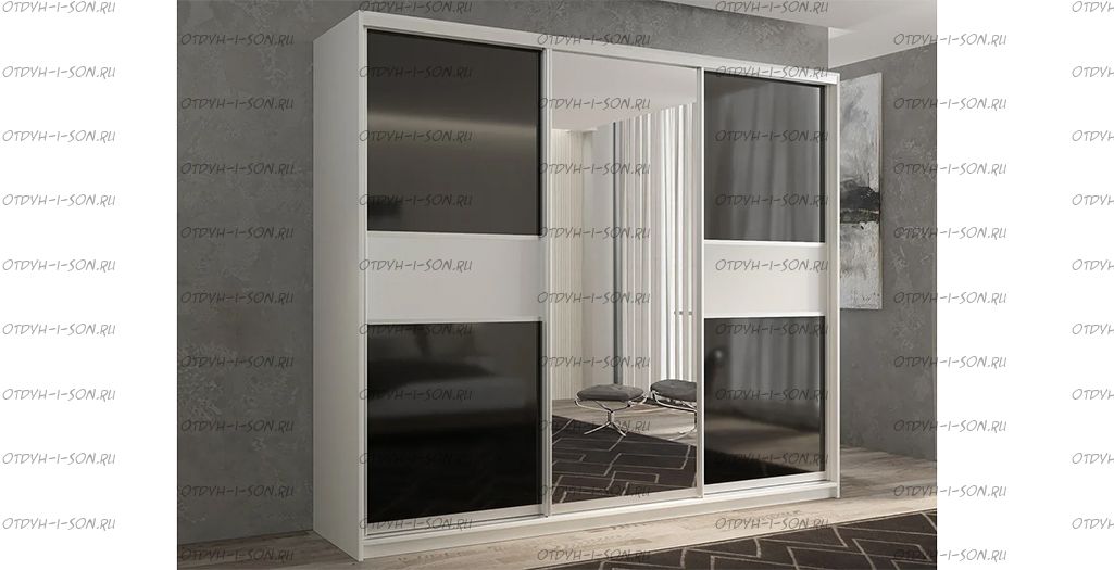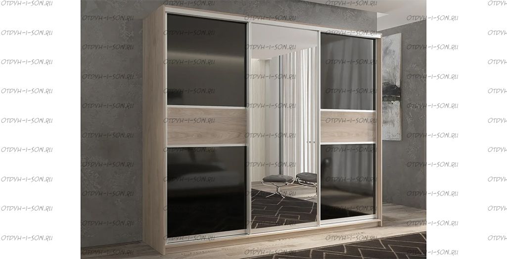 Шкаф-купе трехдверный Кааппи 9 Характеристики: Дверь 1: ЛДСП/Стекло Lacobel черное Дверь 2: Зеркало Дверь 3: ЛДСП/Стекло Lacobel черное Наполнение: 8 полок, 2 штанги (глубина 45 см - штанги выкатные) Полки можно установить в любом месте с шагом 64 мм