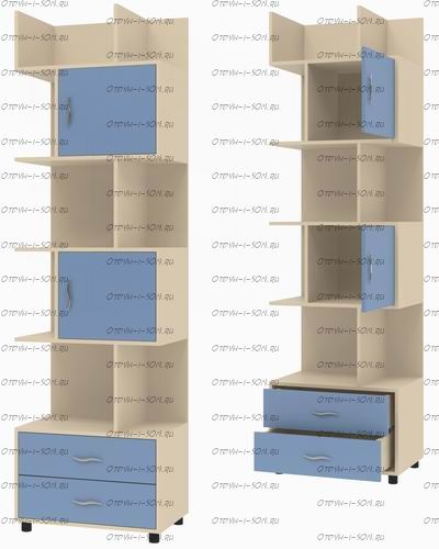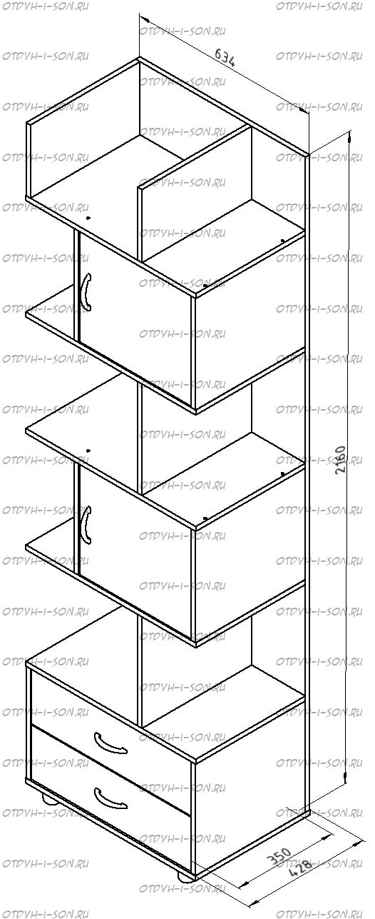 Стеллаж комбинированный Дельта-5.02 Характеристики: Внешние габариты (ШхГхВ): 64х43х216 см. Материалы: ламинированная ДСП 16 мм. Кромка ПВХ толщиной 2 мм производства «Rehau» (Германия) Вес: 60 кг. Объем: 0,12 м3 Цвета корпуса: дуб молочный, дуб сонома, венге, орех Цвета фасадов: ольха, оранжевый, орех, дуб молочный, голубой, салатовый, крем ваниль, розовый, салатовый, венге, зеленый текстиль, желтый