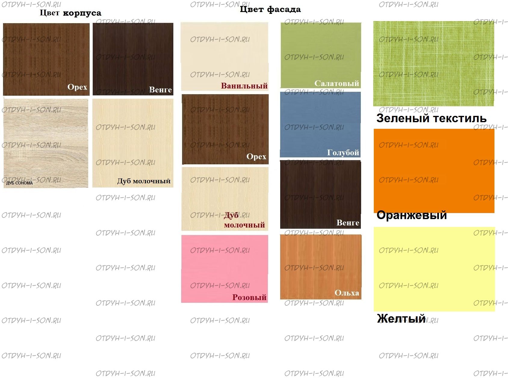 Доступные цвета: Корпус: Дуб молочный, Дуб сонома, Венге, Орех, Белый; Фасады: Белый, Желтый, Ольха, Оранжевый, Орех, Дуб молочный, Голубой, Салатовый, Крем ваниль, Розовый, Венге, Зеленый текстиль |