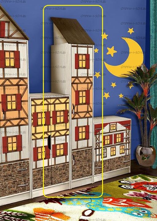 Шкаф-пенал Фанки Кидз Домик Комплектация: Шкаф-пенал узкий Фанки Кидз Домик, арт. 13/10 (ШхГхВ): 393х420х2000 мм. Антресоль к стеллажу Фанки Кидз Домик, СВ-13/74 (ШхГхВ): З9,3х41,5х40,5 см Характеристики: Внешние габариты: (ШхГхВ): 393х420х2400 мм. Материал: ЛДСП 16 мм (Австрия, Egger). Цвет: Дуб Кремона, уф-фотопечать