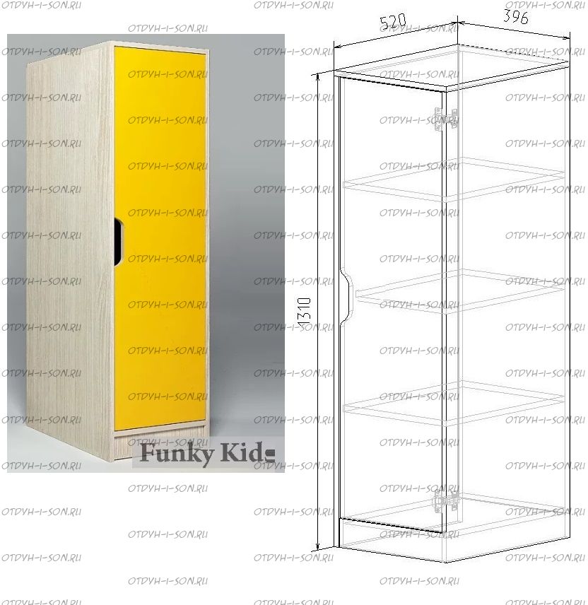 Пенал Фанки Кидз 23/5 это практичное решение в детскую комнату. Шкаф-пенал оснащен полками для хранения одежды. Производится в различных цветах, при заказе обязательно выберете цвет корпуса и фасада. Модуль можно установить под спальным местом кровати чердака Фанки Кидз или в любое помещение с невысокими потолками. Отлично сочетается со всеми модулями данной серии.