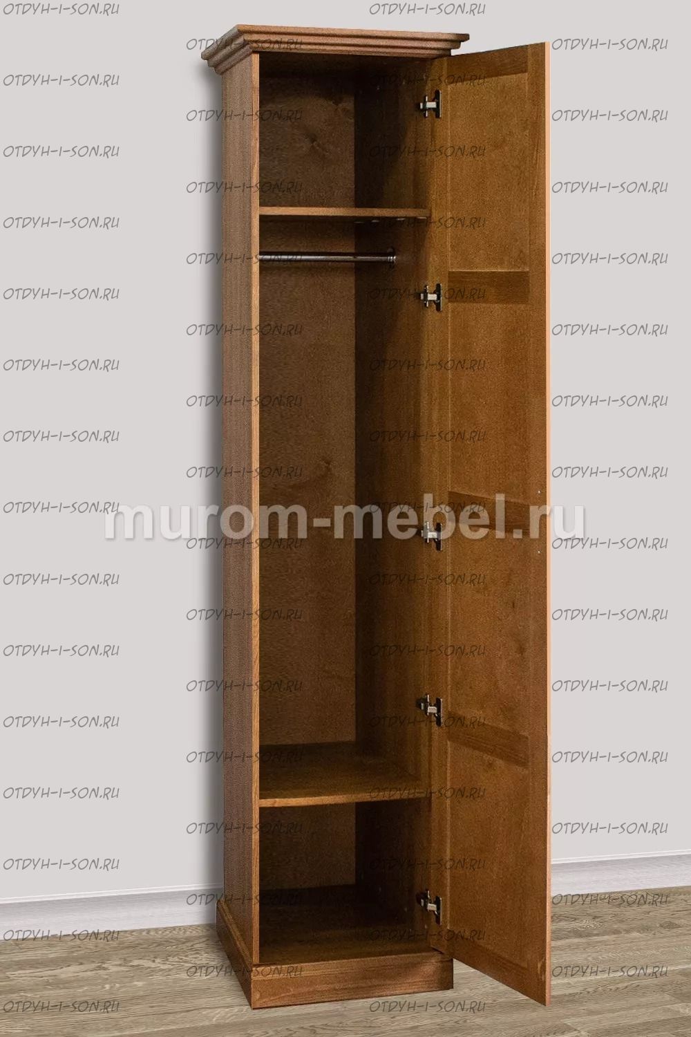Шкаф 1-створчатый Леруа Характеристики: Внешние габариты (ШхГхВ): 500х550х2200 мм Материал: массив дерева Цвета: венге 1, венге 2, венге 3, венге 4, венге тон 2, коричневый тон 2, коричневый 1, коричневый 2, коричневый 3, коричневый 4, красно-коричневый тон 2, красно-коричневый 1, красно-коричневый 2, красно-коричневый 3, красно-коричневый 4, лак Стоимость в цветах Белая эмаль, Слоновая кость, Выбеленный дуб, Венге перламутровый и Красный +25% к стоимости изделия.