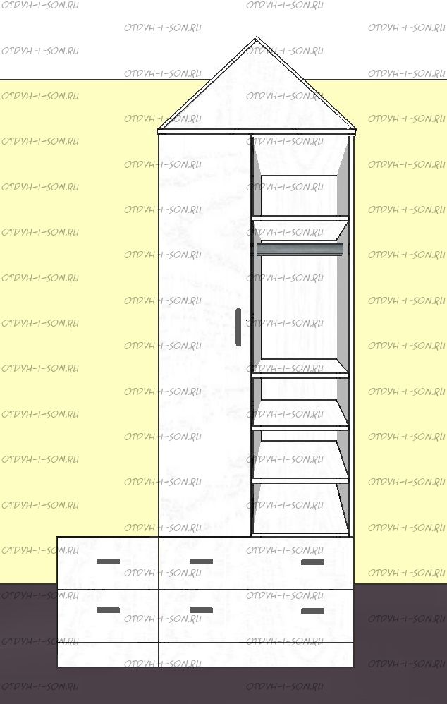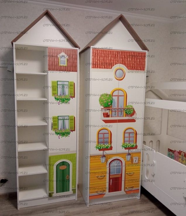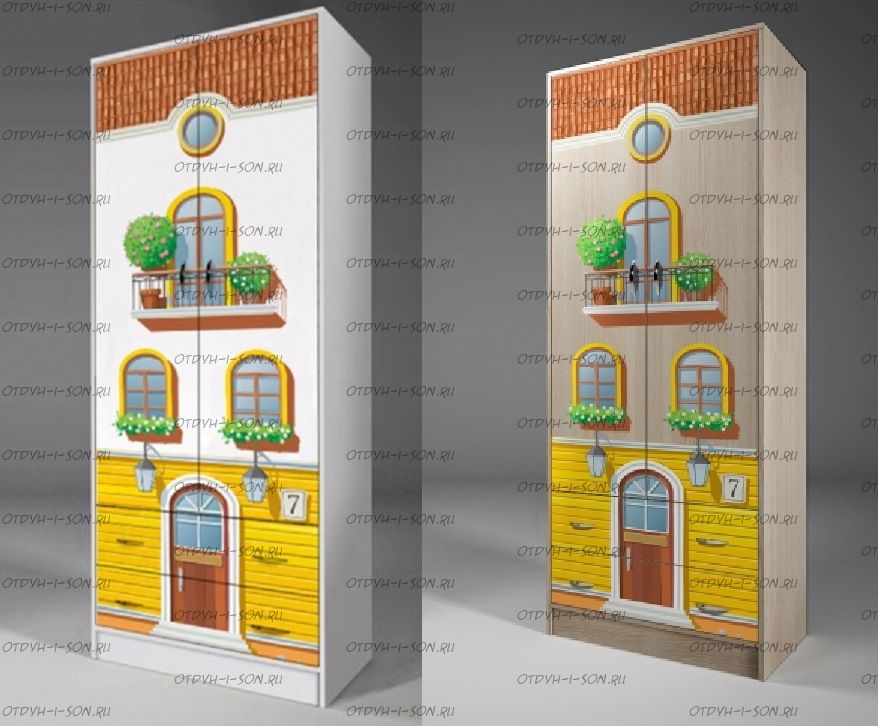 Шкаф Домик 2-дверный Волшебный город Комплектация: Шкаф двухдверный с ящиками Волшебный город 13/3, 750х520х2000 мм. Антресоль к двухдверным шкафам Волшебный город СВ-13/67, 795/750х520/420х398 мм. Характеристики: Внешние габариты двухдверного шкафа вместе с крышей (ШхГхВ): 795/750х520х2400 мм. Вес: 80 кг. Объем: 0,18 м3 Материал: ЛДСП 16 мм (Австрия, Egger). Цвет: любые или Дуб Кремона + уф-фотопечать