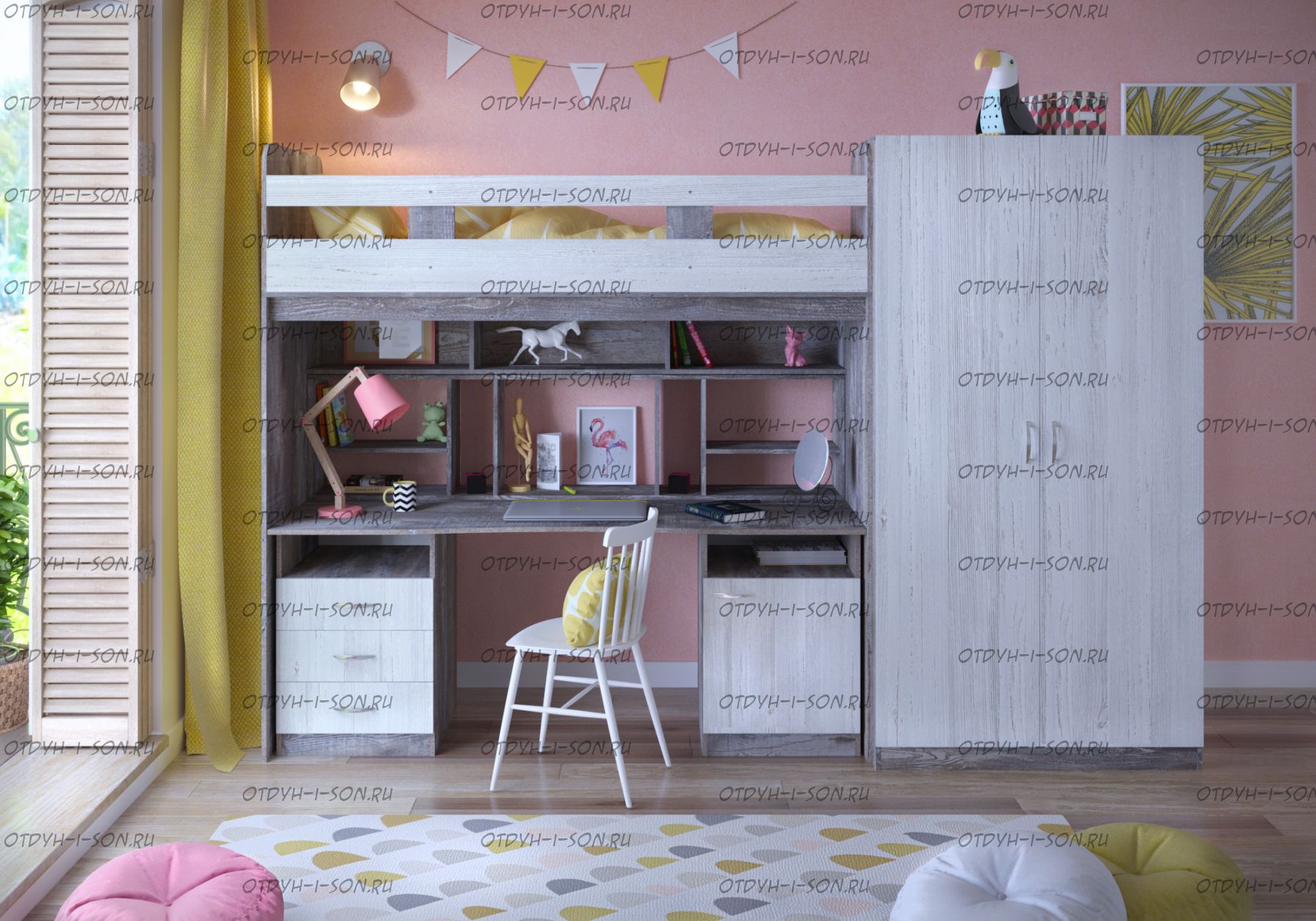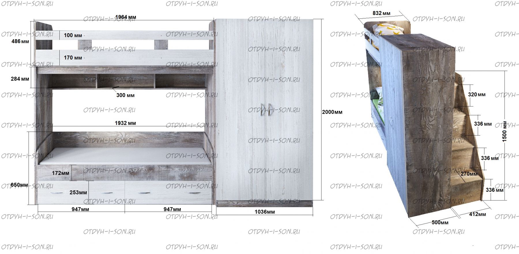 Шкаф 2-дверный Юта от фабрики Ярофф. Характеристики: Габаритные размеры (ШхГхВ): 1036х500х2000 мм. Цвета корпуса/фасада: Бетон/Винтерберг Матрац можно отдельно заказать также на нашем сайте