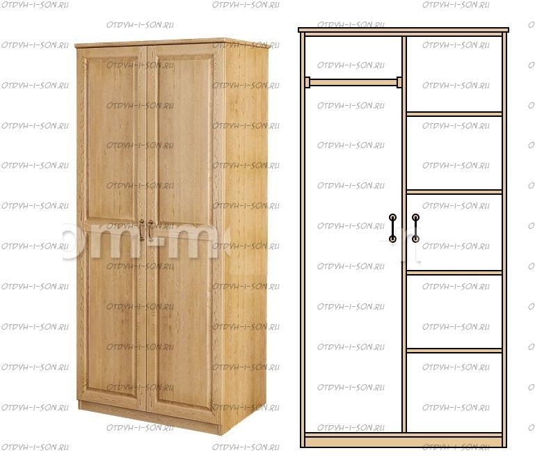 Шкаф 2-дверный ECO-5 Характеристики: Внешние габариты (ШхГхВ): 800х450х1900 мм. Материал: массив дерева Цвета: венге 1, венге 2, венге 3, венге 4, венге тон 2, коричневый тон 2, коричневый 1, коричневый 2, коричневый 3, коричневый 4, красно-коричневый тон 2, красно-коричневый 1, красно-коричневый 2, красно-коричневый 3, красно-коричневый 4, лак Стоимость в цветах Белая эмаль, Слоновая кость, Выбеленный дуб, Венге перламутровый и Красный +25% к стоимости изделия.