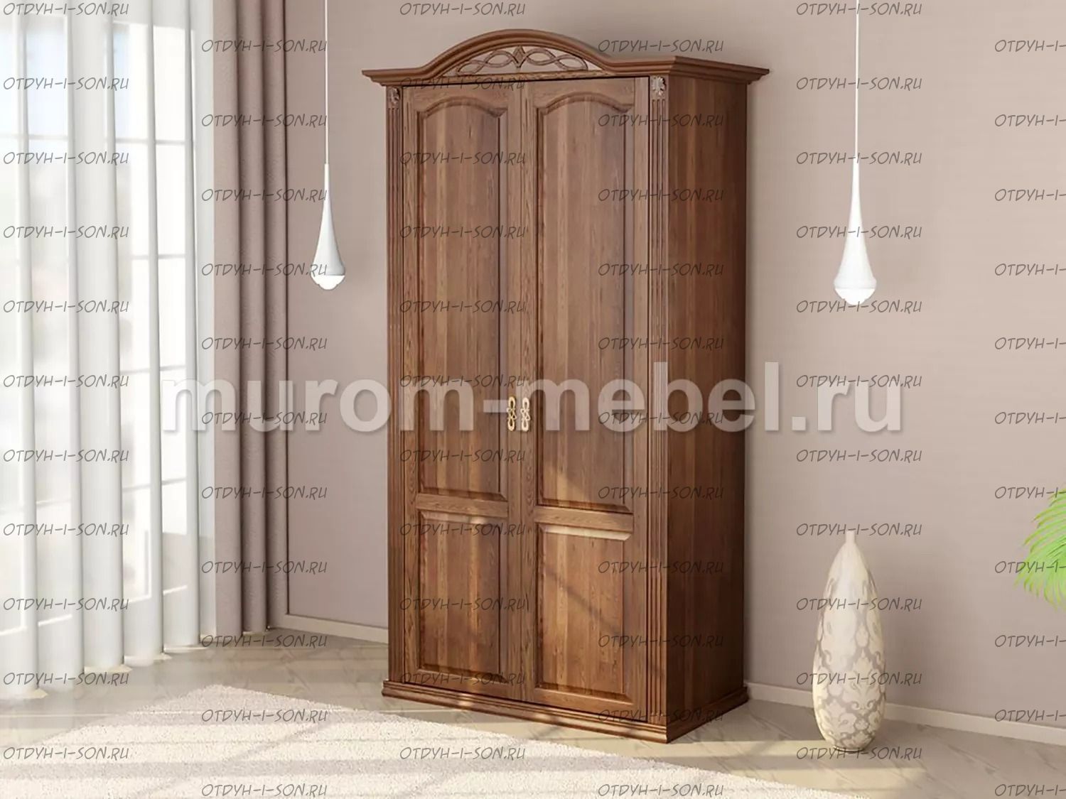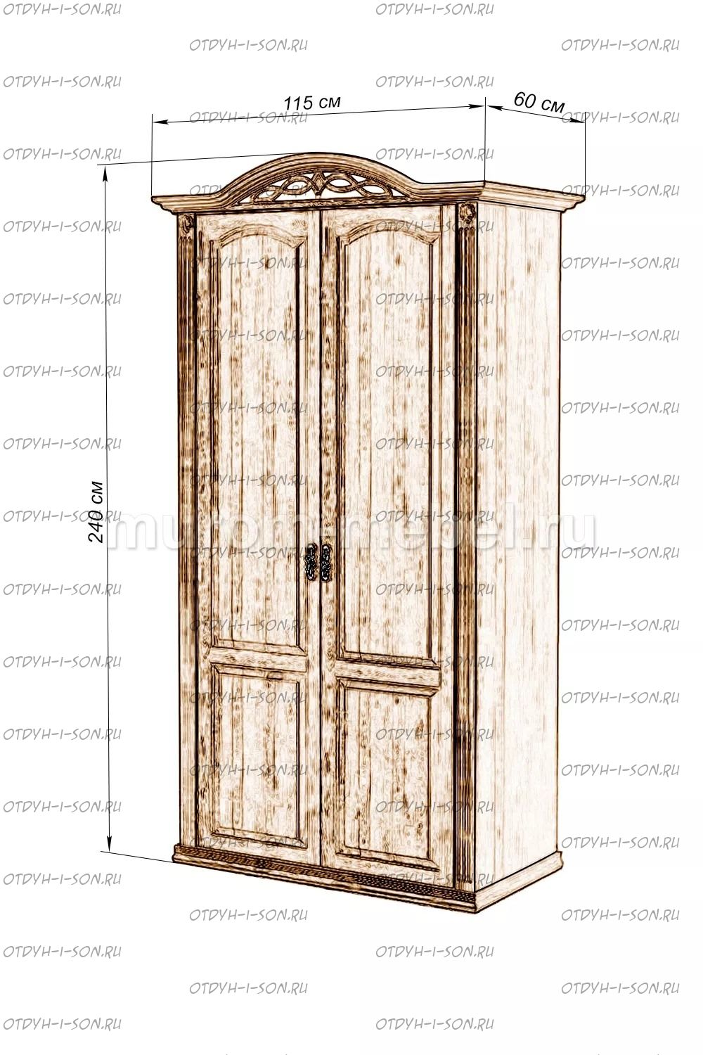 Шкаф 2-х створчатый Камила Характеристики: Внешние габариты (ШхГхВ): 1150х600х2400 Материал: массив дерева Цвета: венге 1, венге 2, венге 3, венге 4, венге тон 2, коричневый тон 2, коричневый 1, коричневый 2, коричневый 3, коричневый 4, красно-коричневый тон 2, красно-коричневый 1, красно-коричневый 2, красно-коричневый 3, красно-коричневый 4, лак Стоимость в цветах Белая эмаль, Слоновая кость, Выбеленный дуб, Венге перламутровый и Красный +25% к стоимости изделия.