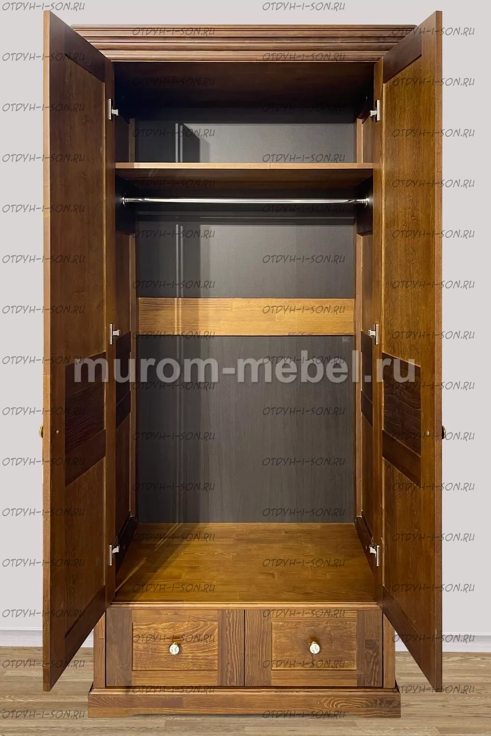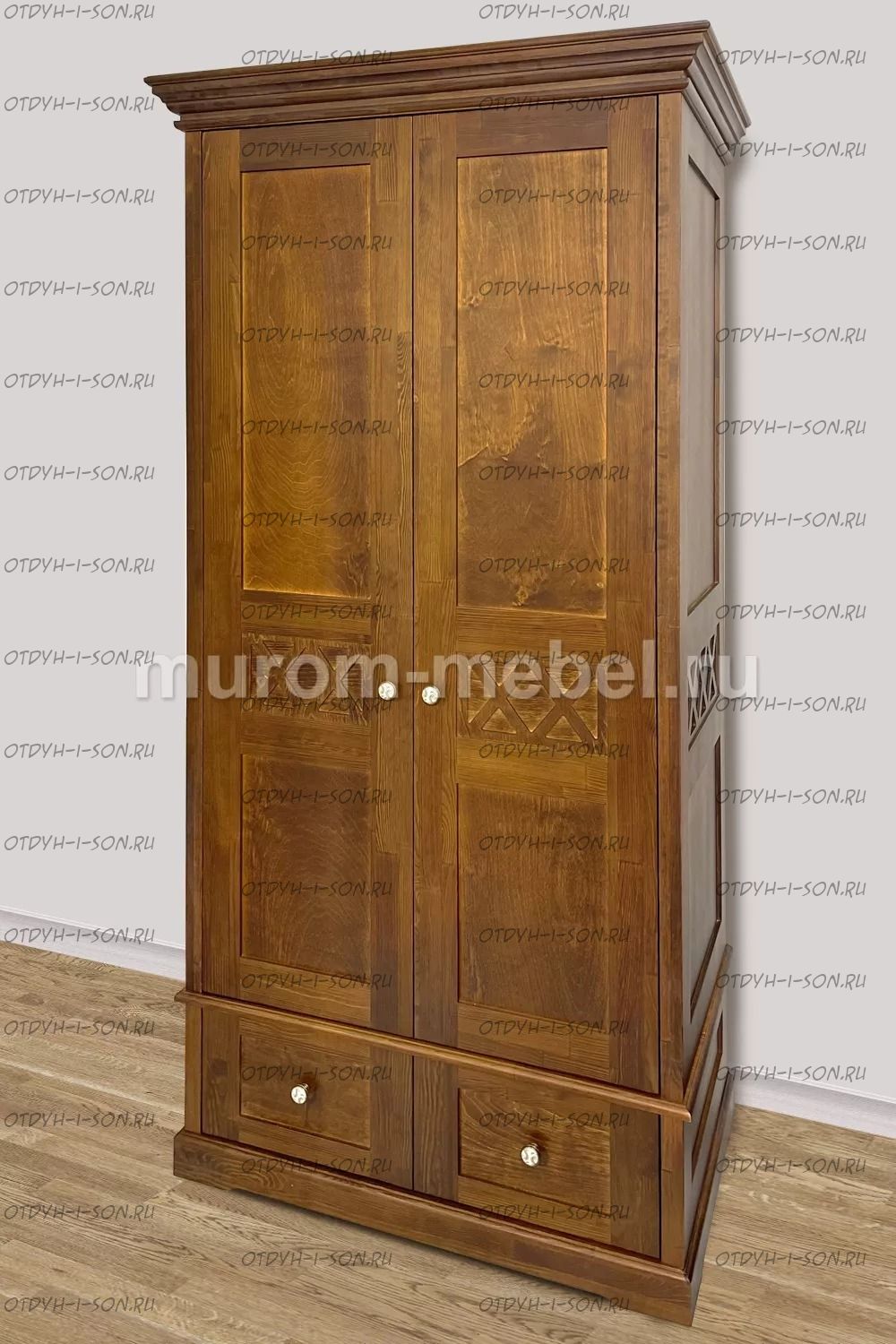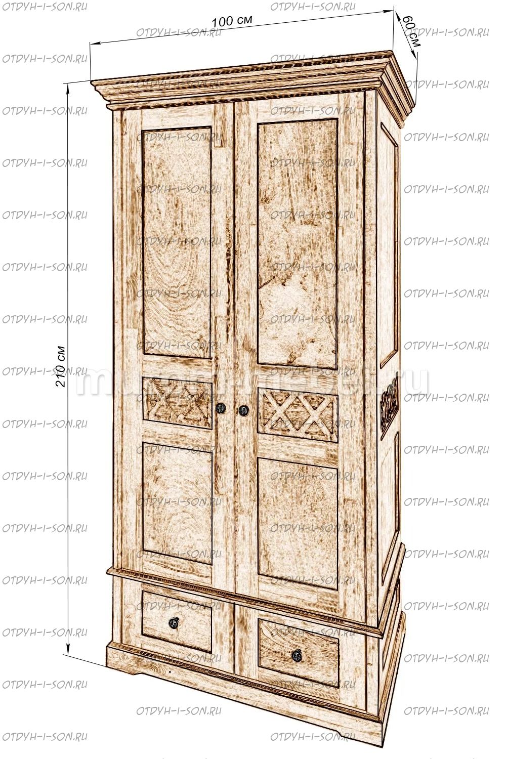 Шкаф 2-х ств. Дубрава Характеристики: Внешние габариты (ШхГхВ): 1 ств. - 1000х600х2100 мм; 3-х ств - 1400х600х2100; 4-х ств - 1850х600х2100 мм Материал: массив дерева Цвета: венге 1, венге 2, венге 3, венге 4, венге тон 2, коричневый тон 2, коричневый 1, коричневый 2, коричневый 3, коричневый 4, красно-коричневый тон 2, красно-коричневый 1, красно-коричневый 2, красно-коричневый 3, красно-коричневый 4, лак Стоимость в цветах Белая эмаль, Слоновая кость, Выбеленный дуб, Венге перламутровый и Красный +25% к стоимости изделия.