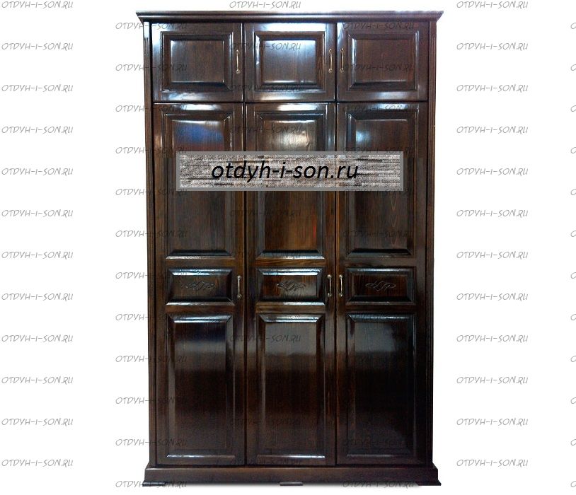 Шкаф 3-дверный Сатори Характеристики: Внешние габариты (ШхГхВ): 1500х550х2400 мм. Материал: массив дерева Цвета: венге 1, венге 2, венге 3, венге 4, венге тон 2, коричневый тон 2, коричневый 1, коричневый 2, коричневый 3, коричневый 4, красно-коричневый тон 2, красно-коричневый 1, красно-коричневый 2, красно-коричневый 3, красно-коричневый 4, лак Стоимость в цветах Белая эмаль, Слоновая кость, Выбеленный дуб, Венге перламутровый и Красный +25% к стоимости изделия.