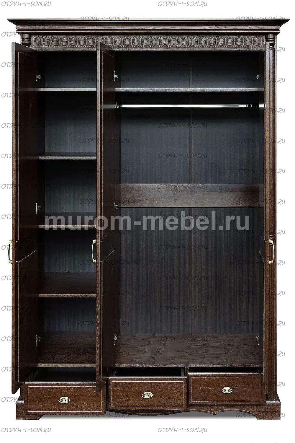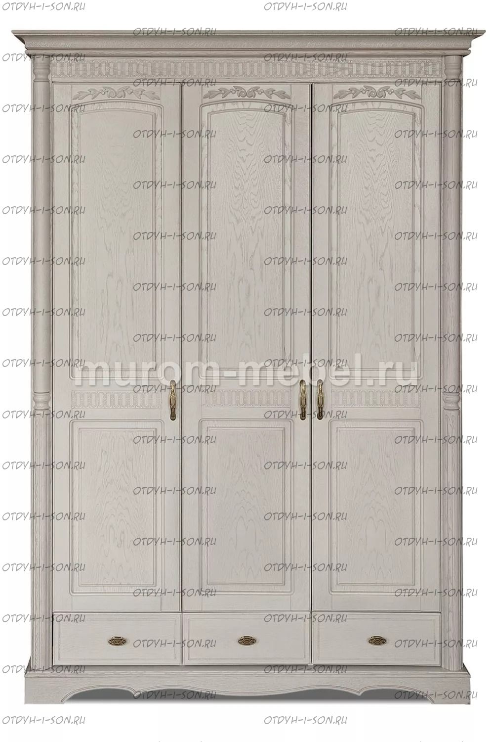 Шкаф 3-х створчатый Валео Характеристики: Внешние габариты: 1500x550х2200 Комбинированная мебель: Массив сосны и вставки из экологически чистой мебельной фанеры Крепления: Цвет: венге 1, венге 2, венге 3, венге 4, венге тон 2, коричневый тон 2, коричневый 1, коричневый 2, коричневый 3, коричневый 4, красно-коричневый тон 2, красно-коричневый 1, красно-коричневый 2, красно-коричневый 3, красно-коричневый 4, лак Изготовление из массива березы плюс 30% Изготовление в белом цвете или слоновая кость плюс 20%