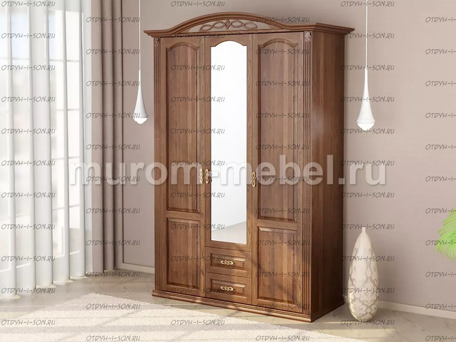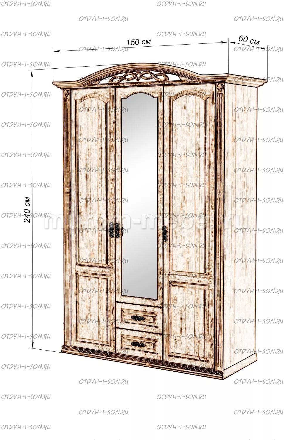 Шкаф 3-х створчатый Камила Характеристики: Внешние габариты (ШхГхВ): 1500х600х2400 Материал: массив дерева Цвета: венге 1, венге 2, венге 3, венге 4, венге тон 2, коричневый тон 2, коричневый 1, коричневый 2, коричневый 3, коричневый 4, красно-коричневый тон 2, красно-коричневый 1, красно-коричневый 2, красно-коричневый 3, красно-коричневый 4, лак Стоимость в цветах Белая эмаль, Слоновая кость, Выбеленный дуб, Венге перламутровый и Красный +25% к стоимости изделия.