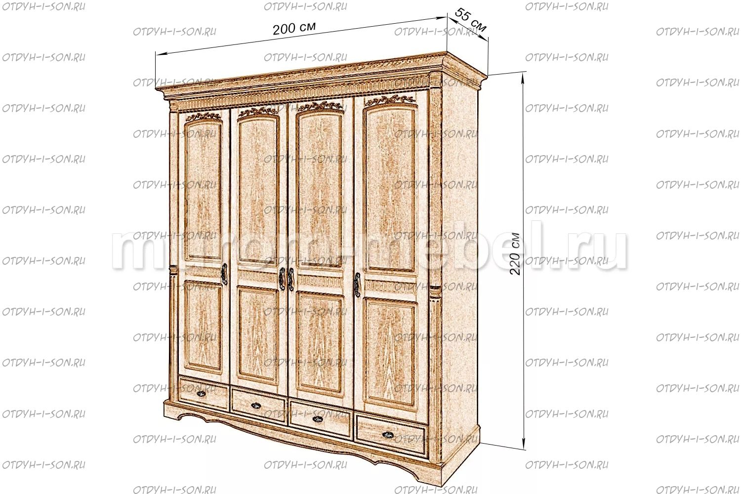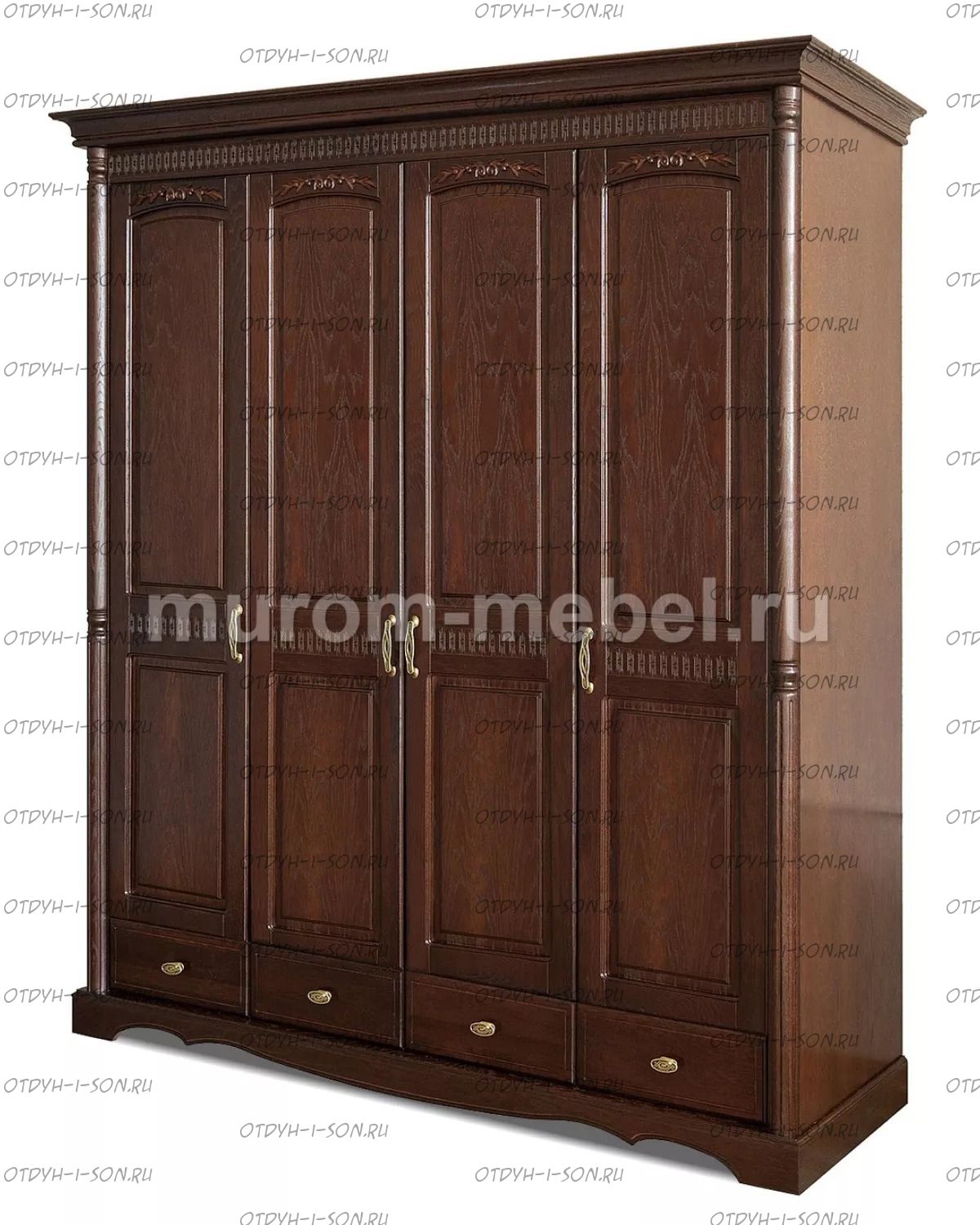 Шкаф 4-х створчатый Валео Характеристики: Внешние габариты: 2000x550х2200 Комбинированная мебель: Массив сосны и вставки из экологически чистой мебельной фанеры Крепления: Цвет: венге 1, венге 2, венге 3, венге 4, венге тон 2, коричневый тон 2, коричневый 1, коричневый 2, коричневый 3, коричневый 4, красно-коричневый тон 2, красно-коричневый 1, красно-коричневый 2, красно-коричневый 3, красно-коричневый 4, лак Изготовление из массива березы плюс 30% Изготовление в белом цвете или слоновая кость плюс 20%