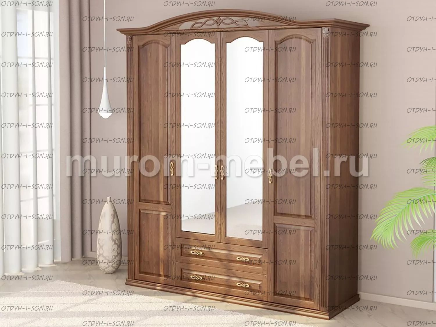 Шкаф 4-х створчатый Камила Характеристики: Внешние габариты (ШхГхВ): 1800х600х2400 Материал: массив дерева Цвета: венге 1, венге 2, венге 3, венге 4, венге тон 2, коричневый тон 2, коричневый 1, коричневый 2, коричневый 3, коричневый 4, красно-коричневый тон 2, красно-коричневый 1, красно-коричневый 2, красно-коричневый 3, красно-коричневый 4, лак Стоимость в цветах Белая эмаль, Слоновая кость, Выбеленный дуб, Венге перламутровый и Красный +25% к стоимости изделия.