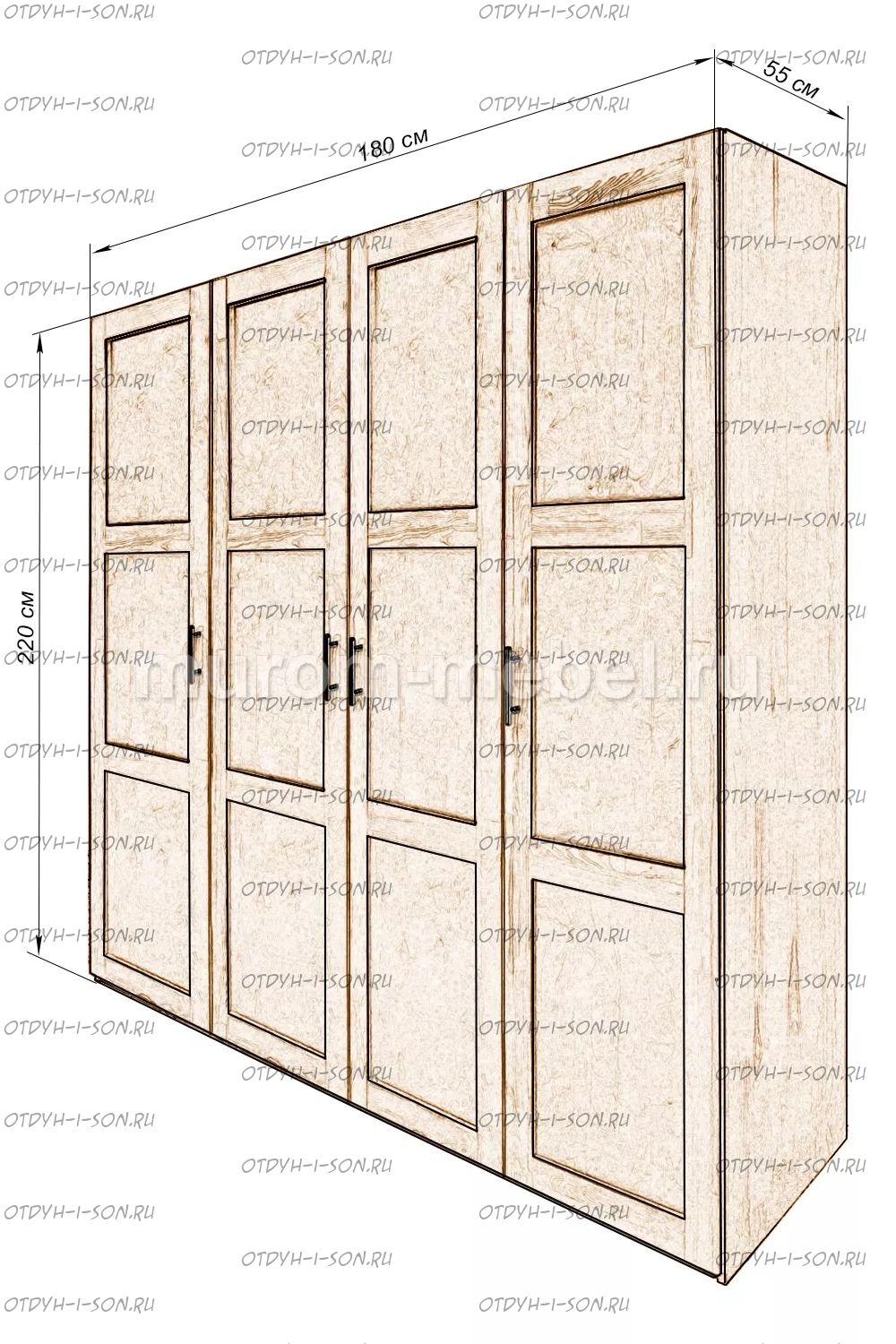 Шкаф 4-х створчатый Марко Характеристики: Внешние габариты (ШхГхВ): 1800х550х2200 мм Материал: массив дерева Цвета: венге 1, венге 2, венге 3, венге 4, венге тон 2, коричневый тон 2, коричневый 1, коричневый 2, коричневый 3, коричневый 4, красно-коричневый тон 2, красно-коричневый 1, красно-коричневый 2, красно-коричневый 3, красно-коричневый 4, лак Стоимость в цветах Белая эмаль, Слоновая кость, Выбеленный дуб, Венге перламутровый и Красный +25% к стоимости изделия.
