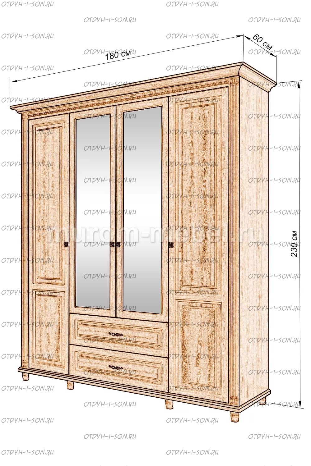 Шкаф 4-х створчатый Мелиса Характеристики: Внешние габариты: 1800x600х2300 Комбинированная мебель: Массив сосны и вставки из экологически чистой мебельной фанеры Крепления: Цвет: венге 1, венге 2, венге 3, венге 4, венге тон 2, коричневый тон 2, коричневый 1, коричневый 2, коричневый 3, коричневый 4, красно-коричневый тон 2, красно-коричневый 1, красно-коричневый 2, красно-коричневый 3, красно-коричневый 4, лак Изготовление из массива березы плюс 30% Изготовление в белом цвете или слоновая кость плюс 20%