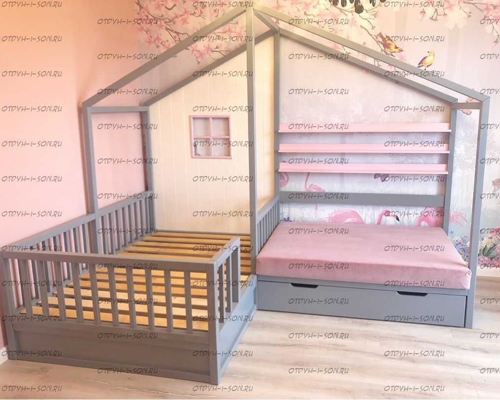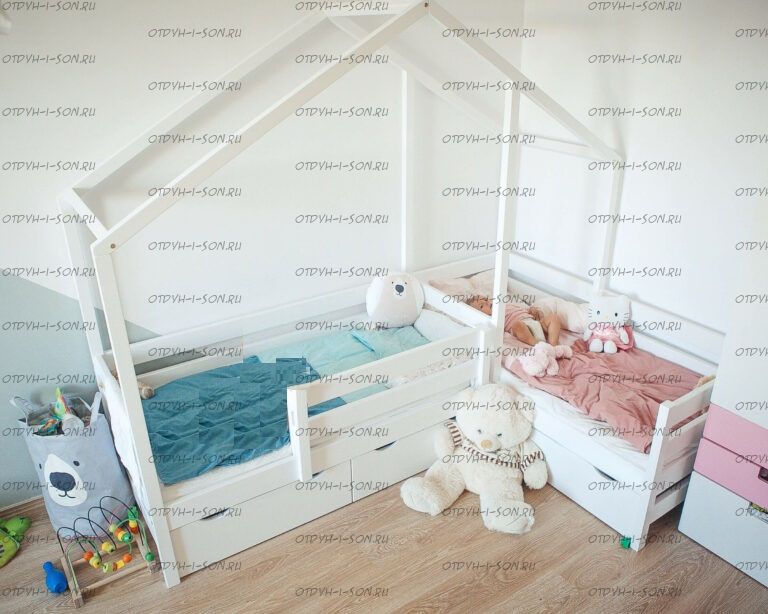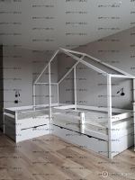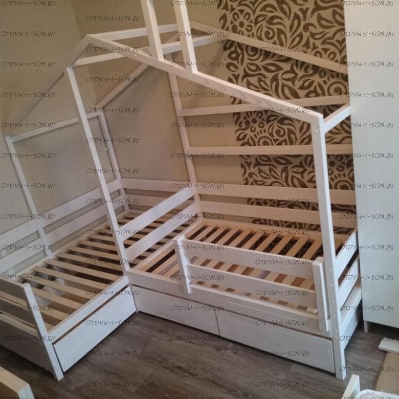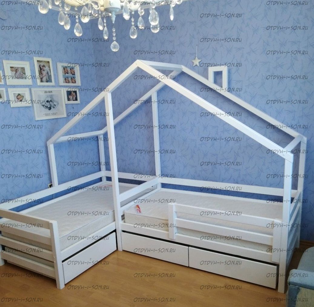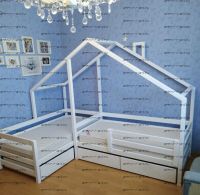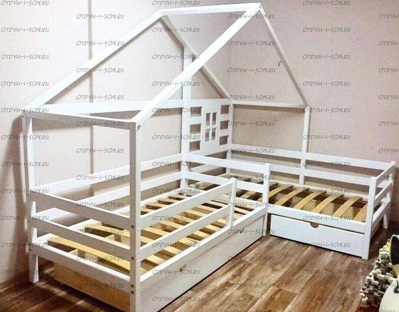 Кровать Домик угловой Fairy Land №24 (для двоих детей) - это угловая кровать домик для двоих детей. Данная кровать может быть выполнена с учетом любых Ваших пожеланий, мы изготавливаем данную угловую кровать домик с различными ящиками, полочками, бортиками или без них. Крышу кровати домика также можно сделать симметричной или ассиметричной при желании. Мы покрываем наши изделия только качественными, нетоксичными красками.