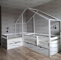 Кровать Домик угловой Fairy Land №17 - это угловая кровать домик для двоих детей. Данная кровать может быть выполнена с учетом любых Ваших пожеланий, мы изготавливаем данную угловую кровать домик с различными ящиками, полочками, бортиками или без них. Крышу кровати домика также можно сделать симметричной или ассиметричной при желании. Мы покрываем наши изделия только качественными, нетоксичными красками.