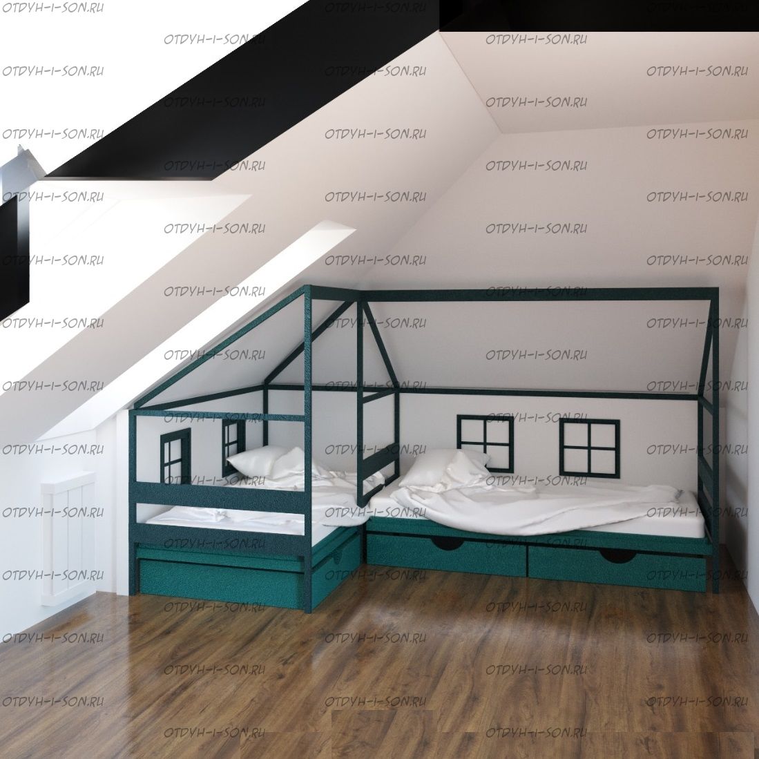 Кровать Домик угловой Fairy Land Мансарда №45 - это угловая кровать домик для двоих детей. Данная кровать может быть выполнена с учетом любых Ваших пожеланий, мы изготавливаем данную угловую кровать домик с различными ящиками, полочками, бортиками или без них. Крышу кровати домика также можно сделать симметричной или ассиметричной при желании. Мы покрываем наши изделия только качественными, нетоксичными красками.